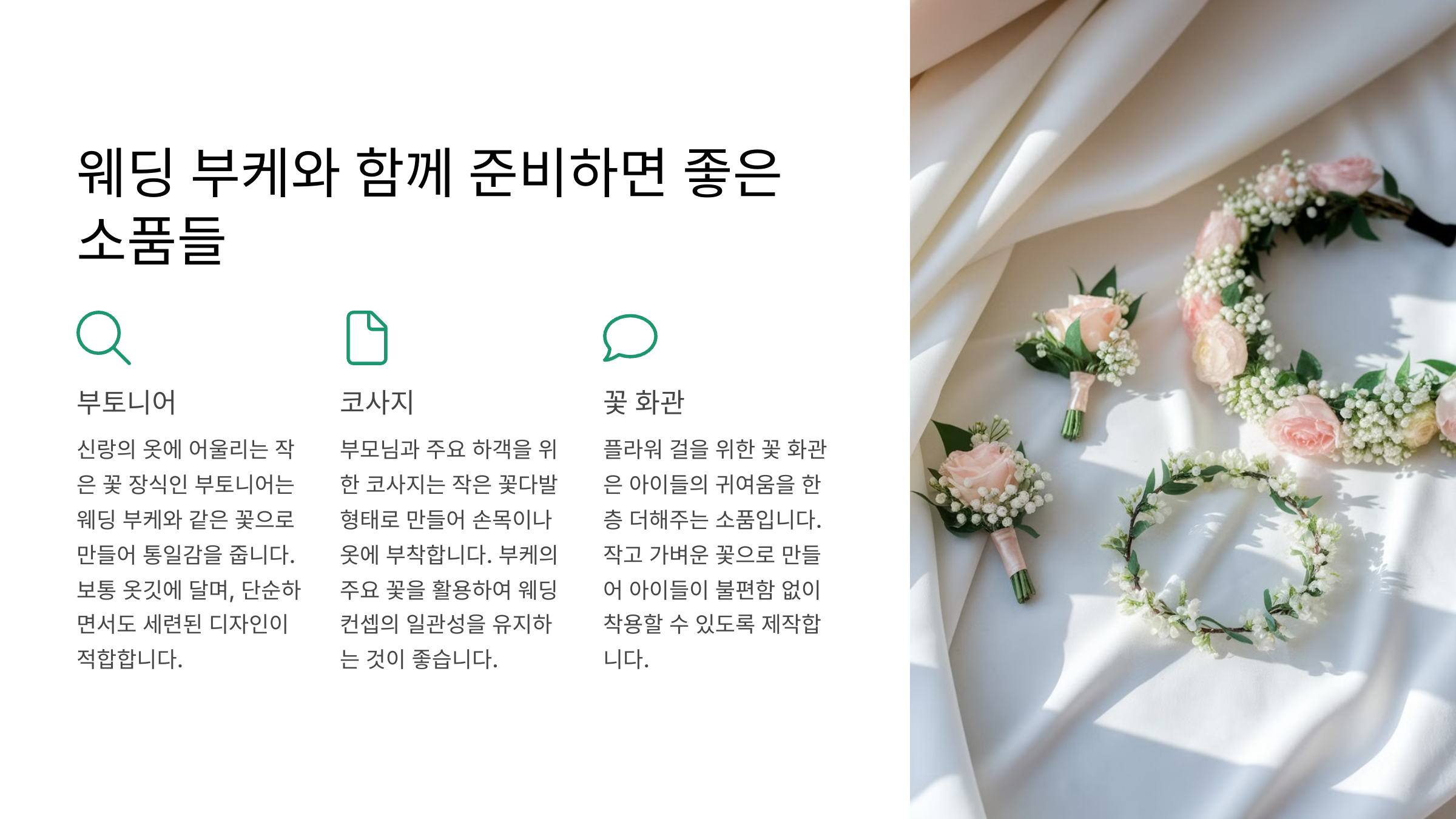 | 생화 또는 조화 | 원하는 스타일에 맞게 선택 |