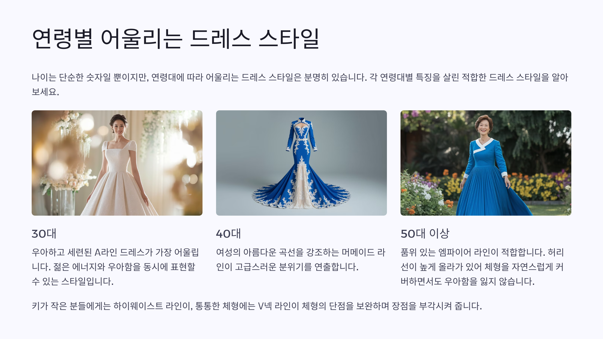 연령대에 맞는 드레스를 선택하면 더욱 자연스럽고 아름다운 분위기를 연출할 수 있어요! 😊