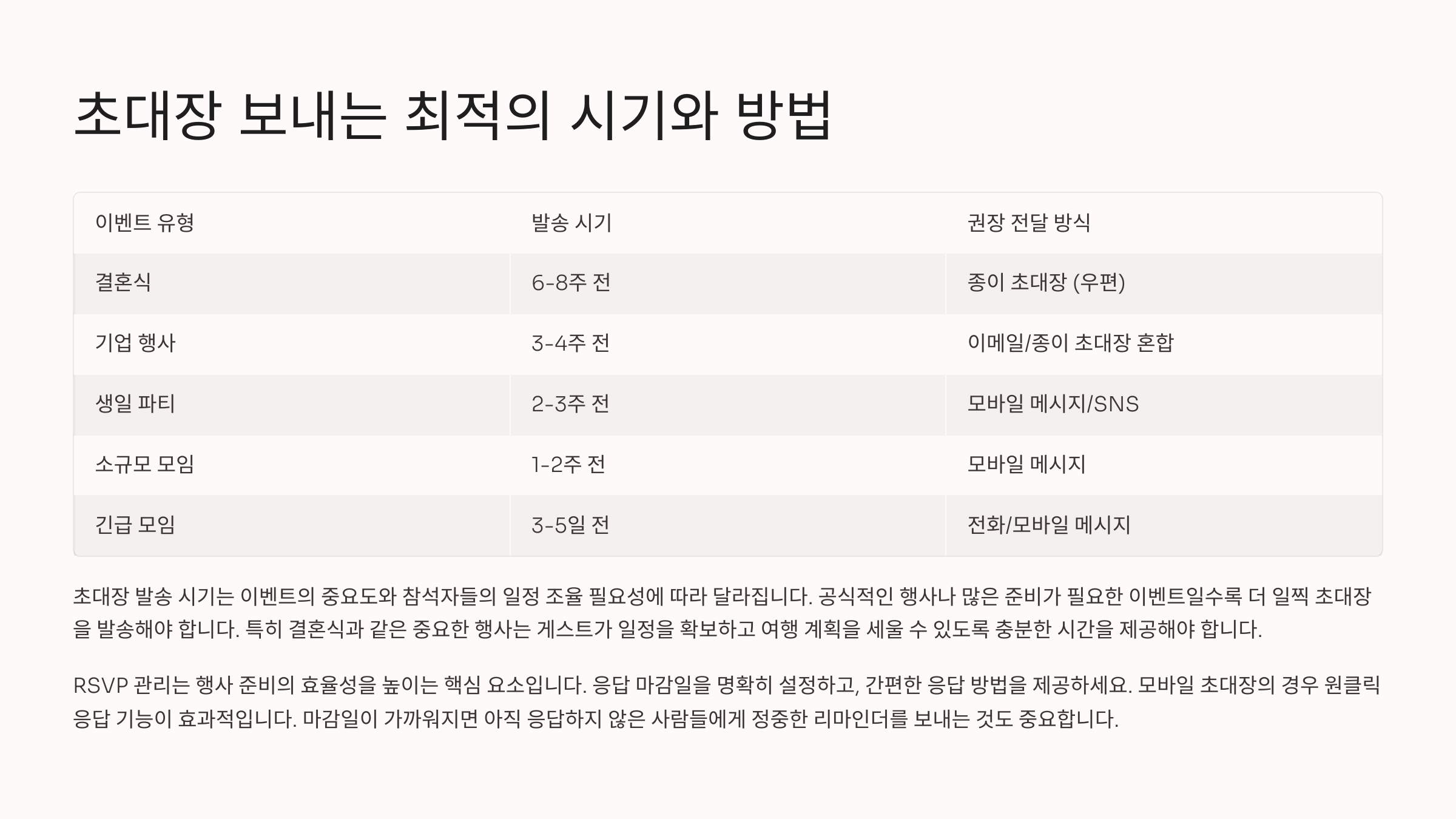다음 섹션에서는 초대장을 보내는 최적의 시기와 방법을 알아볼게요! 📅📩