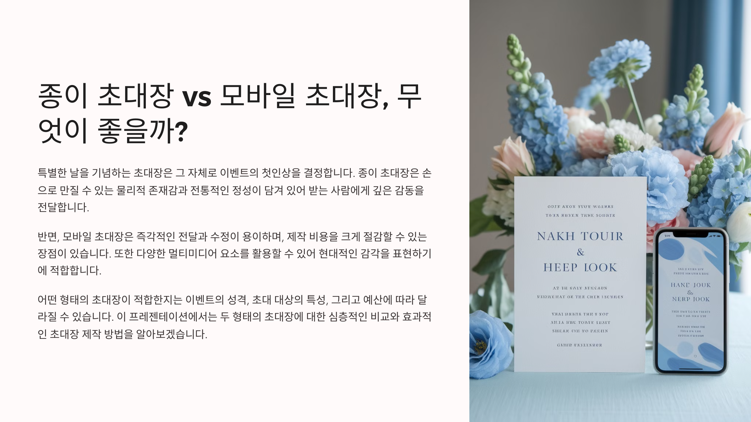 | 종이 초대장 | 고급스러움, 소장 가능 | 제작 비용 & 시간 소요 |