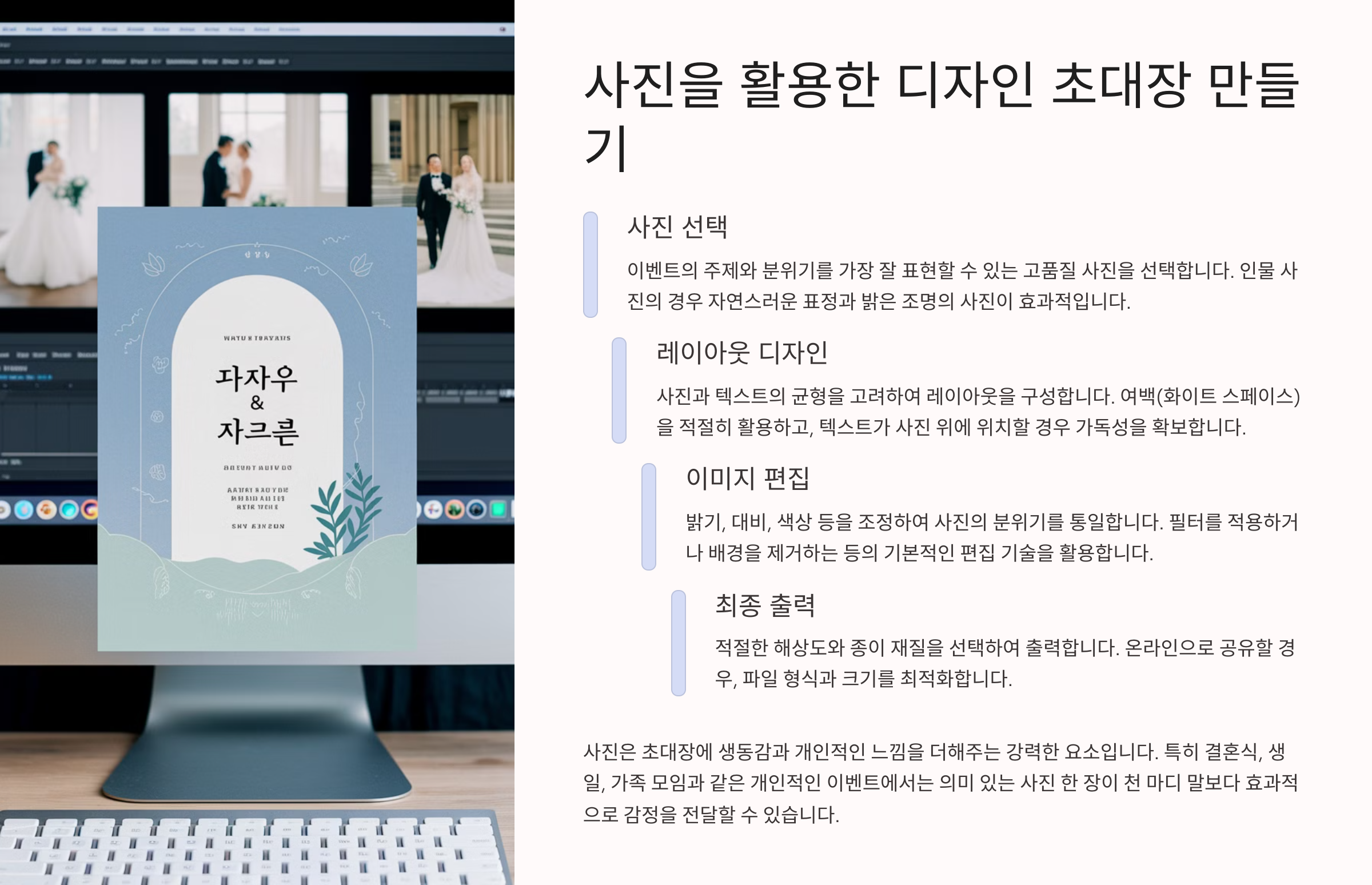 - 📷 고해상도 사진 선택 – 인쇄용 초대장은 화질이 중요한 만큼 선명한 이미지를 골라야 해요.