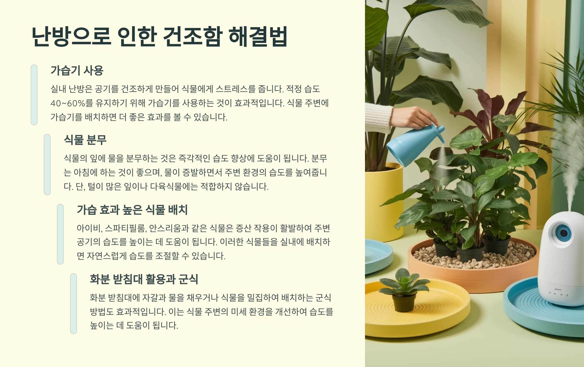 ✅ **가습기 사용** - 난방으로 건조해진 공기를 촉촉하게 만들어 식물도 보호하고 건강에도 좋아요.