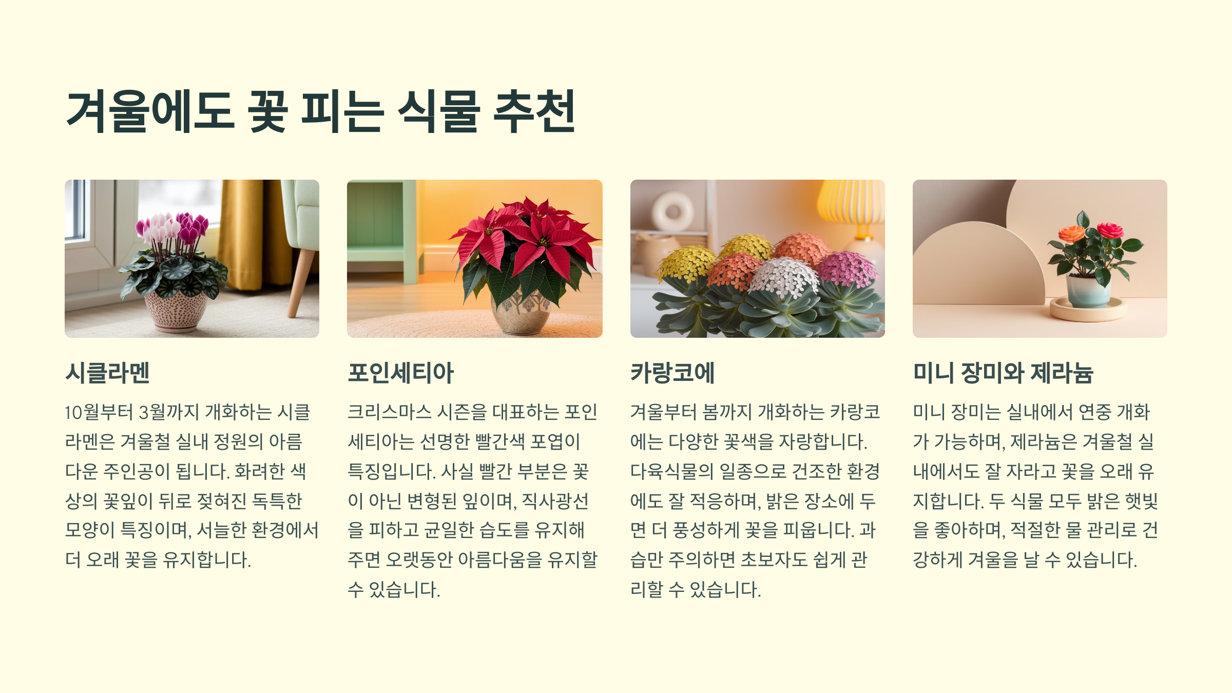 겨울철에도 아름다운 꽃을 감상할 수 있는 식물들이 있어요! 추운 계절에도 화사한 분위기를 연출할 수 있는 꽃 피는 식물들을 소개할게요. 🌿🌺