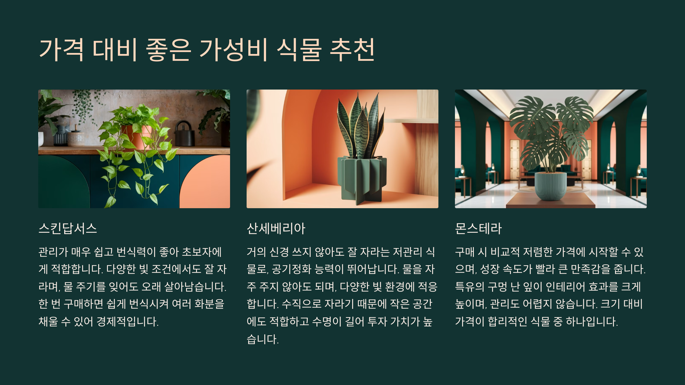 | 산세베리아 | 5,000~15,000원 | 공기 정화, 물 주기 적음 |