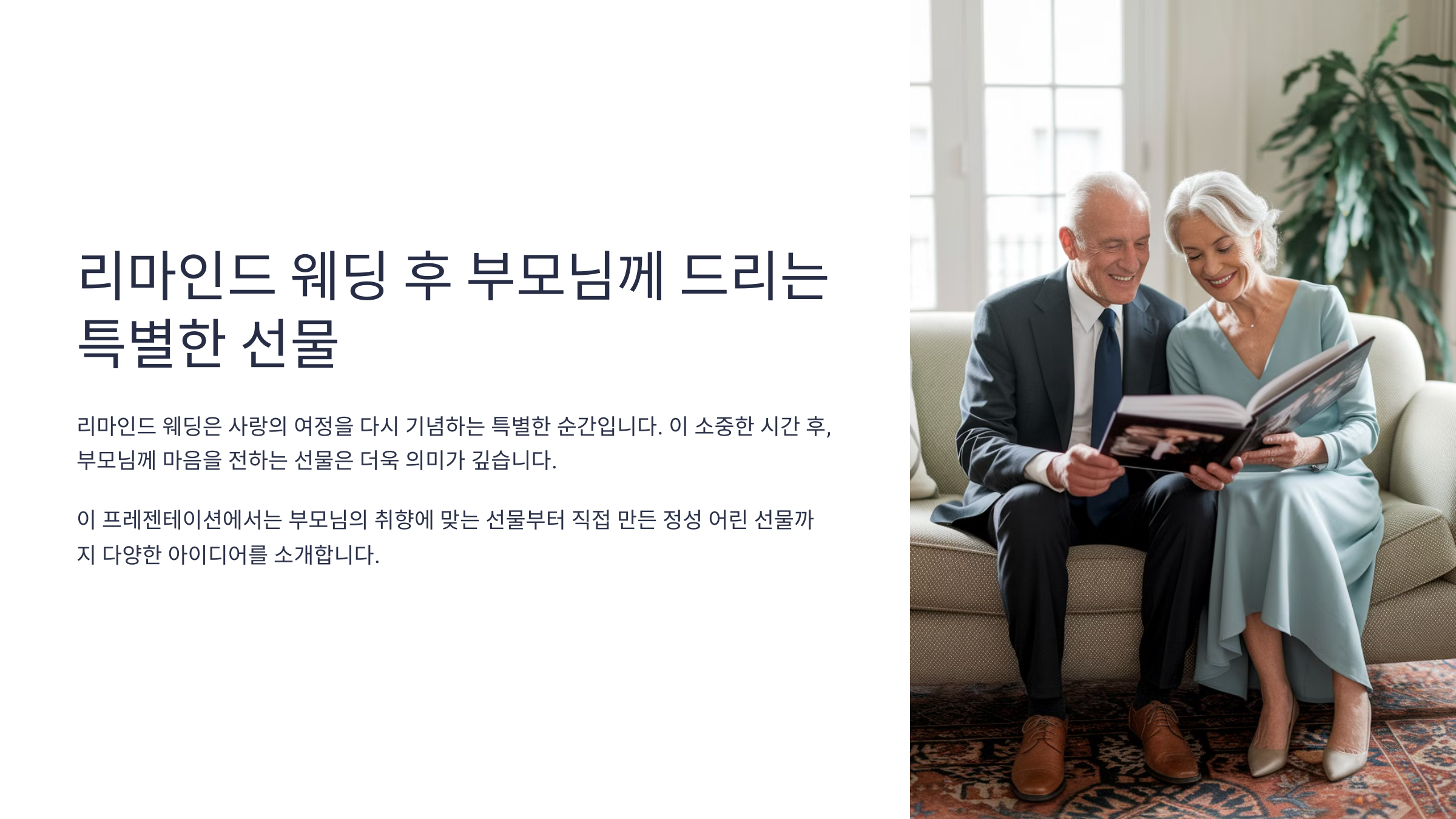 리마인드 웨딩의 가장 큰 매력 중 하나는 **새로운 웨딩 사진을 남길 수 있다는 점**이에요. 부모님과 함께 찍은 사진을 활용한 특별한 선물을 준비하면 더욱 의미가 깊어질 거예요! 🎞️