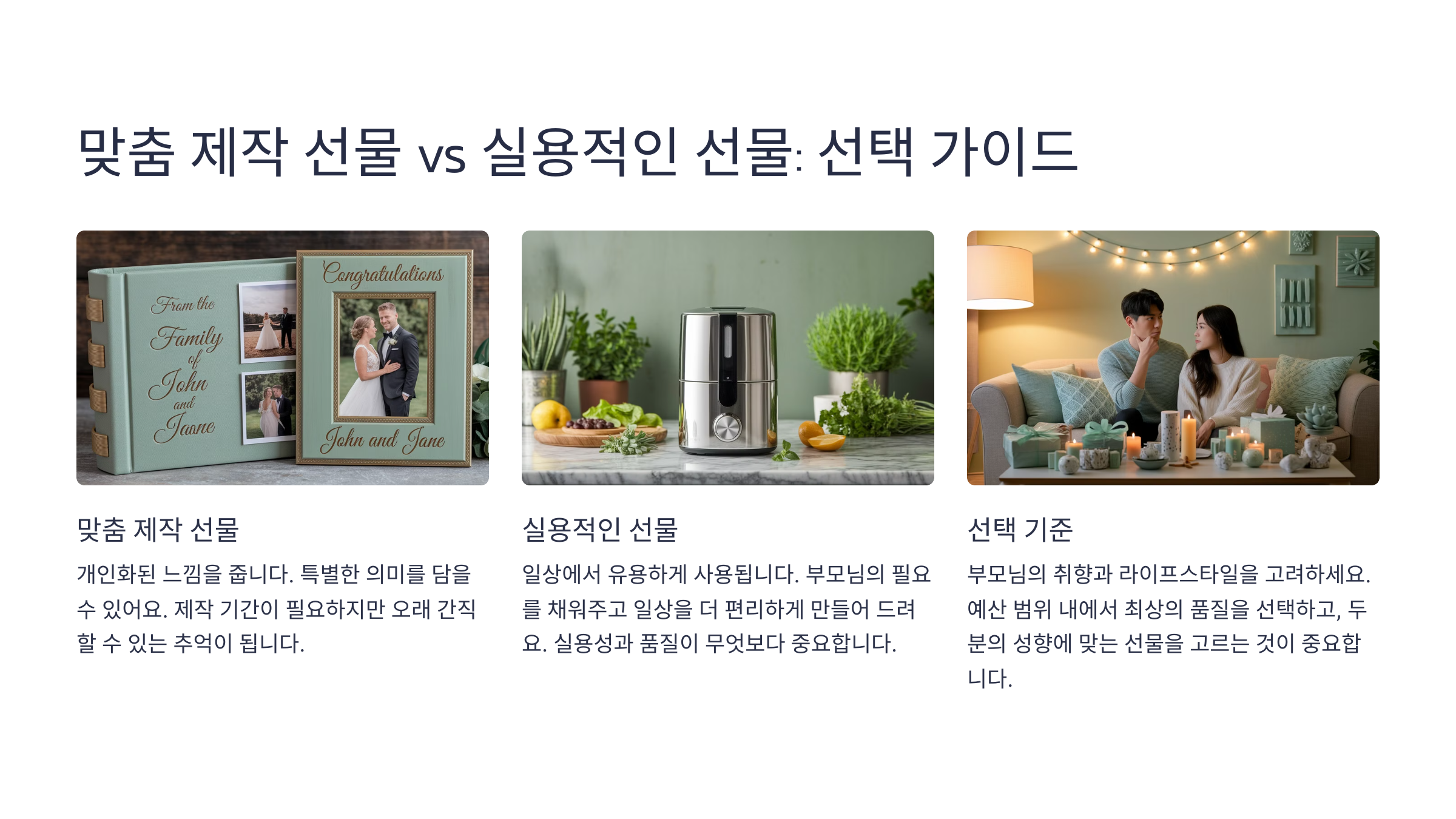 부모님께 드릴 선물을 고를 때, ‘맞춤 제작 선물’과 ‘실용적인 선물’ 중 어떤 것이 더 좋을지 고민될 수 있어요. 두 가지 선물 유형의 장점과 선택 팁을 알려드릴게요! 😉