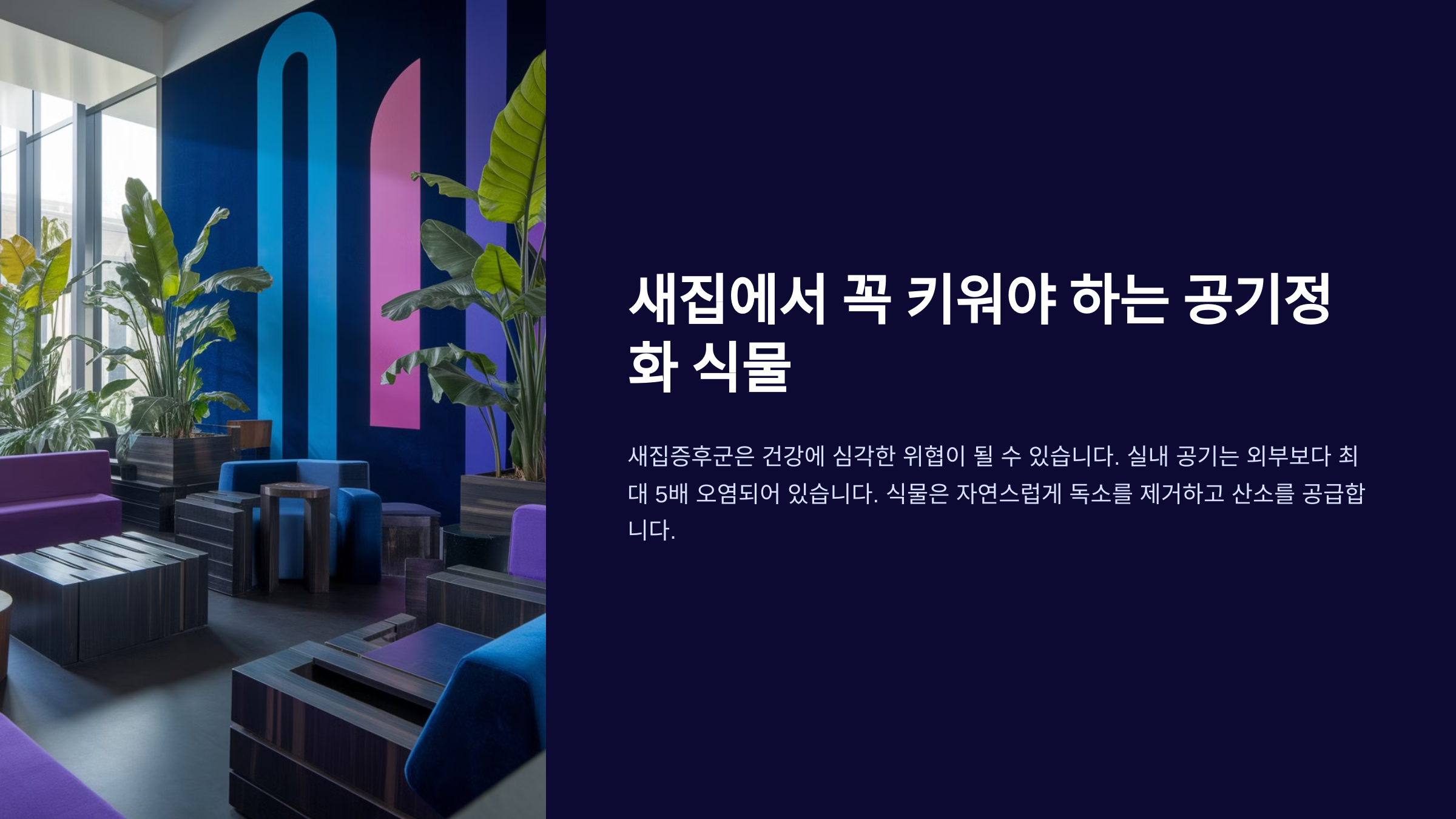 이 식물들을 집 안 곳곳에 배치하면 **새집증후군을 예방하고 실내 공기를 깨끗하게 유지할 수 있어요!** 🌿💚
