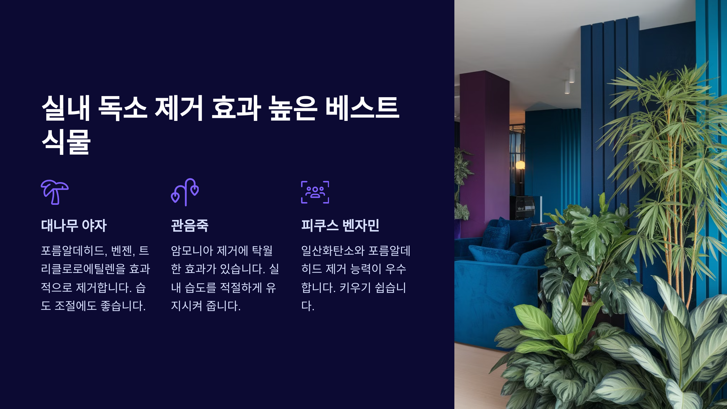 ✅ **스파티필럼** – 포름알데히드, 벤젠, 암모니아 제거 효과가 뛰어나요. ✅ **아레카야자** – 천연 가습기 역할을 하며 실내 공기를 촉촉하게 유지해 줘요. ✅ **산세베리아** – 밤에도 산소를 배출하는 식물로, 침실에 두면 좋아요. ✅ **관음죽** – 음이온을 발생시켜 공기 중 독소를 정화하는 능력이 있어요. ✅ **아이비(헤데라 헬릭스)** – 포름알데히드, 톨루엔 제거 능력이 강력해요.