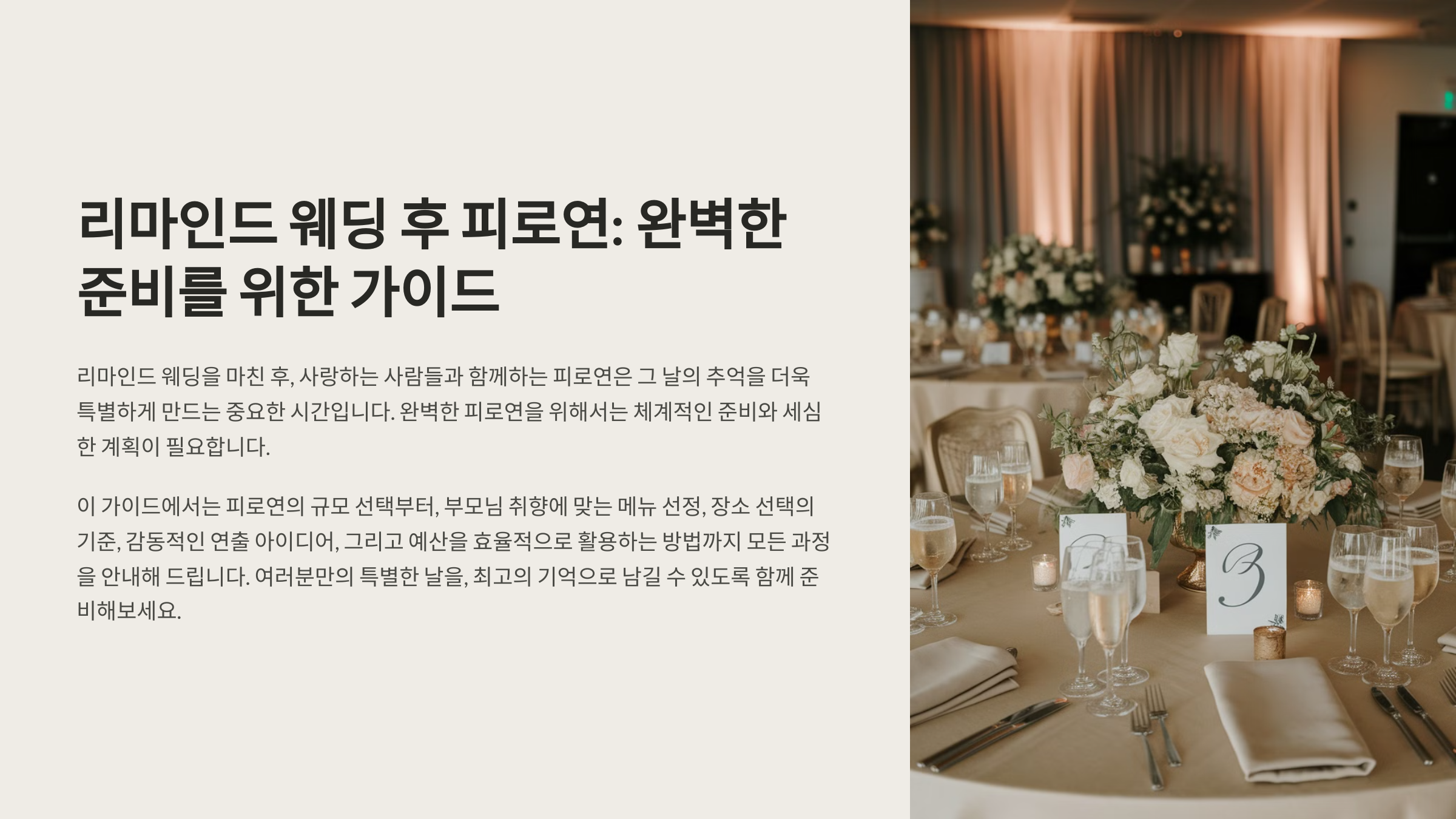 리마인드 웨딩을 한 후, **소중한 분들과 함께 특별한 순간을 나누는 피로연!** 🎊 어떻게 하면 의미 있고 감동적인 자리가 될까요?