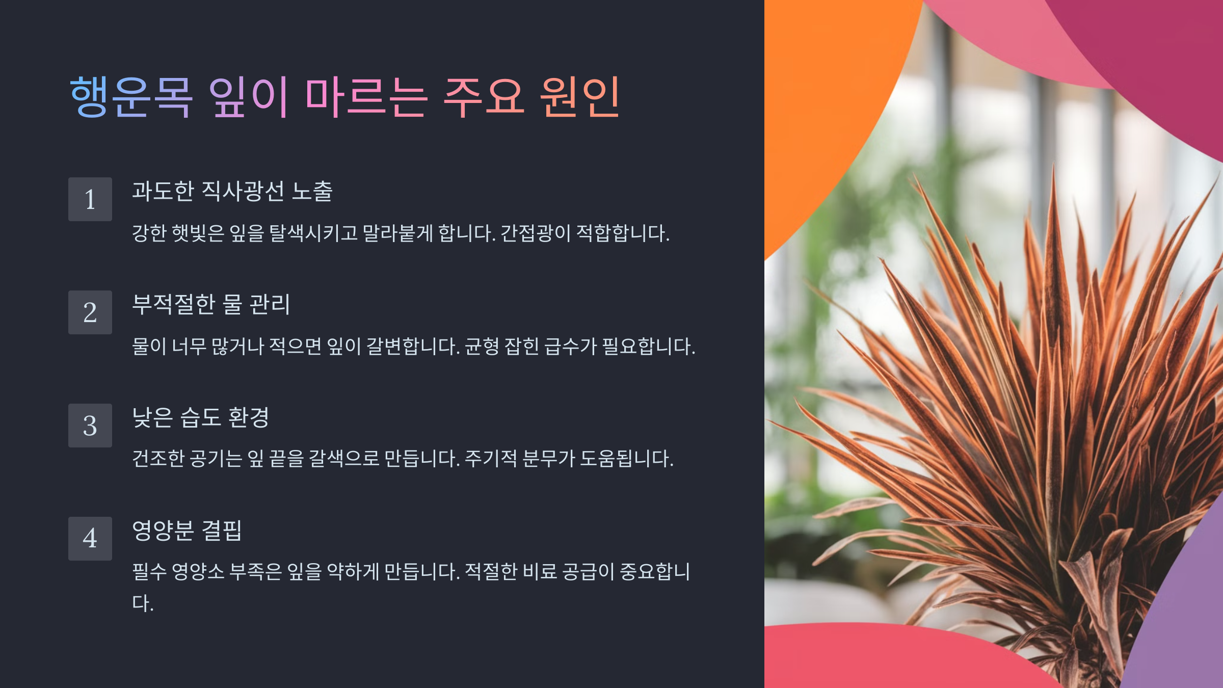 행운목은 적당한 습도를 유지해야 해요. 물이 부족하면 잎끝부터 마르면서 색이 변해요. 특히 여름철 건조한 환경에서는 주의해야 해요.