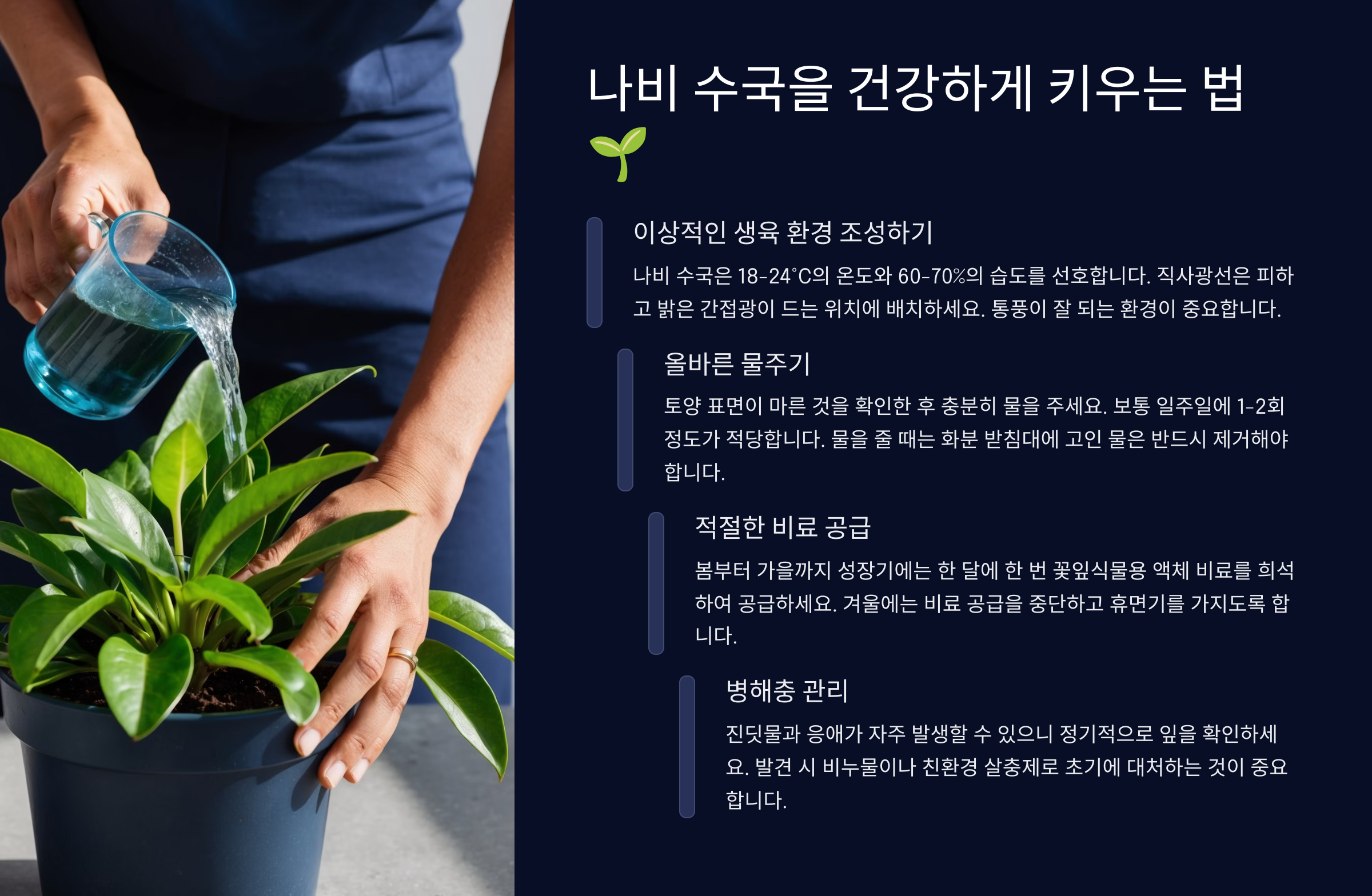 1️⃣ **적절한 햇빛 조건 🌞** 나비 수국은 **반그늘을 좋아하는 식물**이에요. 너무 강한 햇빛은 잎을 태울 수 있으므로, **오전 햇살이 들고 오후에는 그늘지는 장소**가 최적이에요.