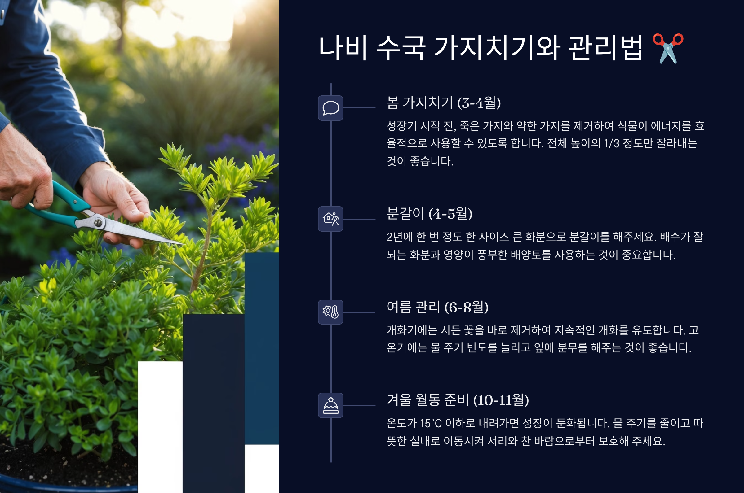 | 가지치기 후 관리 | 비료 추가, 물 충분히 주기 |