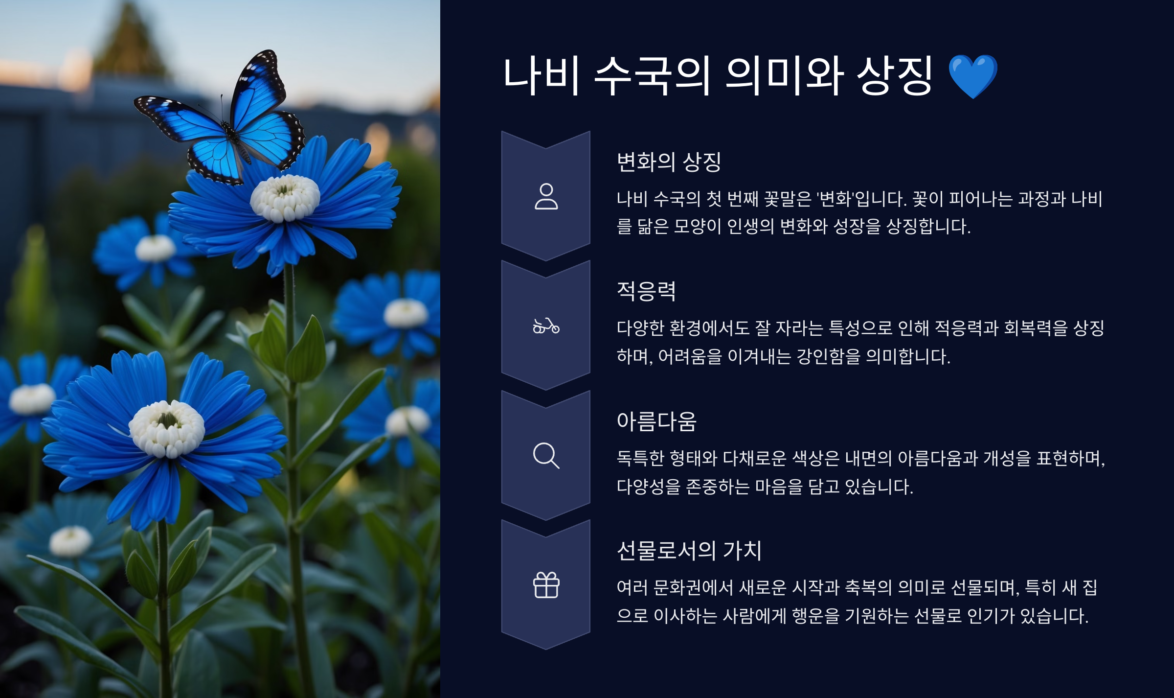 1️⃣ **변화와 적응 🦋** 나비 수국은 토양의 산도에 따라 색이 변하는 특징이 있어요. 그래서 환경에 적응하는 힘을 의미하며, 변화에 유연하게 대응하는 능력을 상징한답니다.