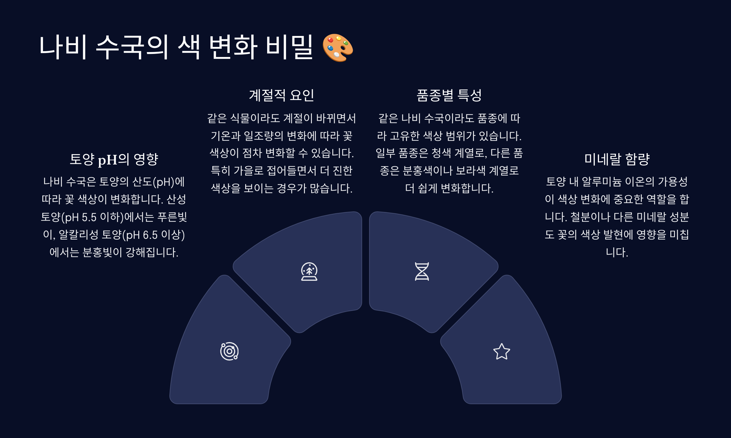 1️⃣ **파란색 수국 💙** 토양이 **산성(pH 5.5 이하)**일 때, 알루미늄이 쉽게 흡수되면서 꽃이 푸른색을 띠게 돼요. 산성 흙을 유지하면 파란 나비 수국을 볼 수 있어요.