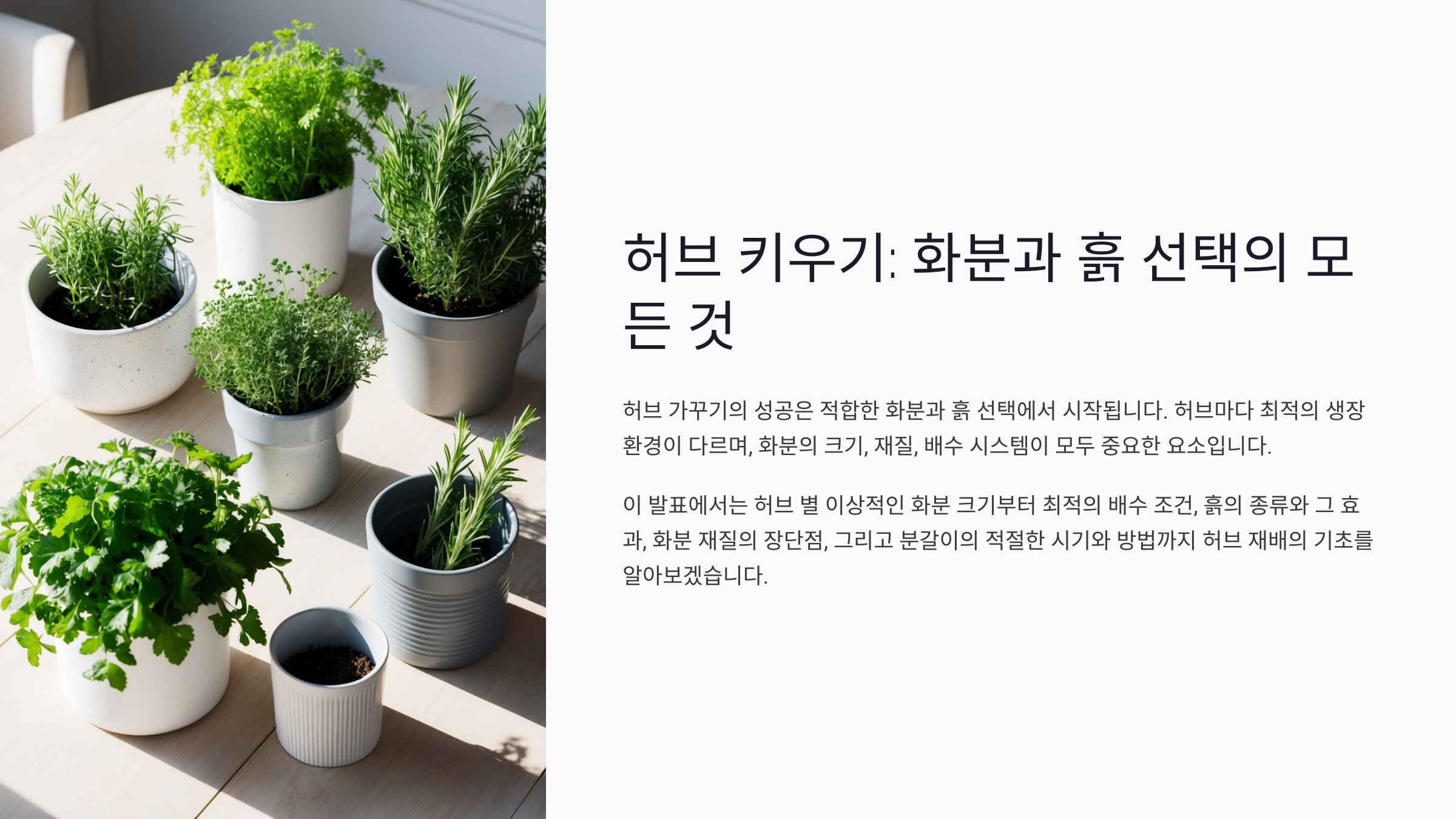 | 추천 허브 | 바질, 민트, 오레가노 | 로즈마리, 라벤더, 타임 |