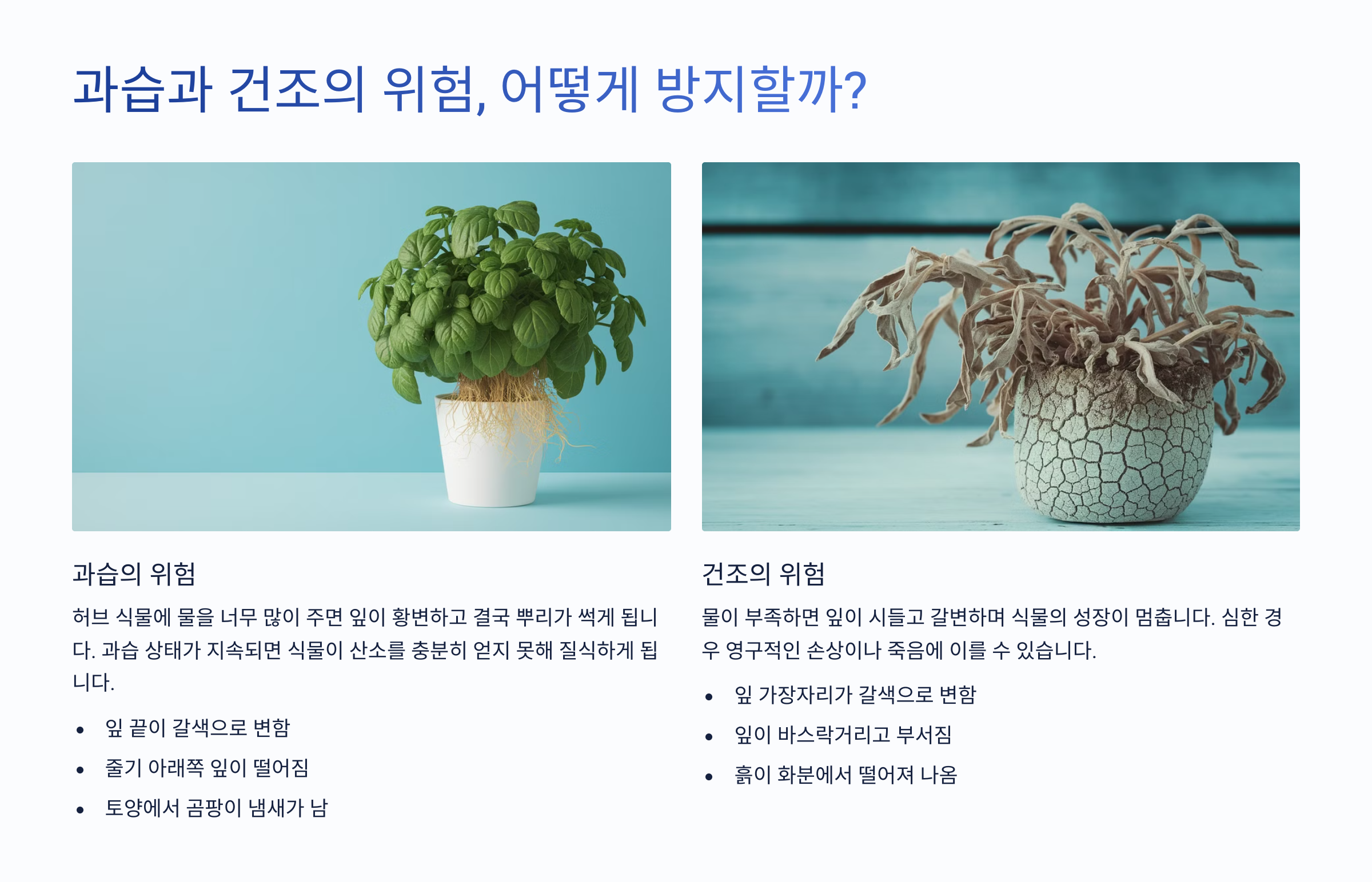 허브 물 주기, 허브 과습, 허브 건조, 실내 화분 배수, 수돗물 식물, 허브 응급처치, 허브 잎 처짐, 허브 키우는 법, 빗물 사용, 아침 물주기 나의 말: 네네네네네 ChatGPT의 말: html 복사 편집