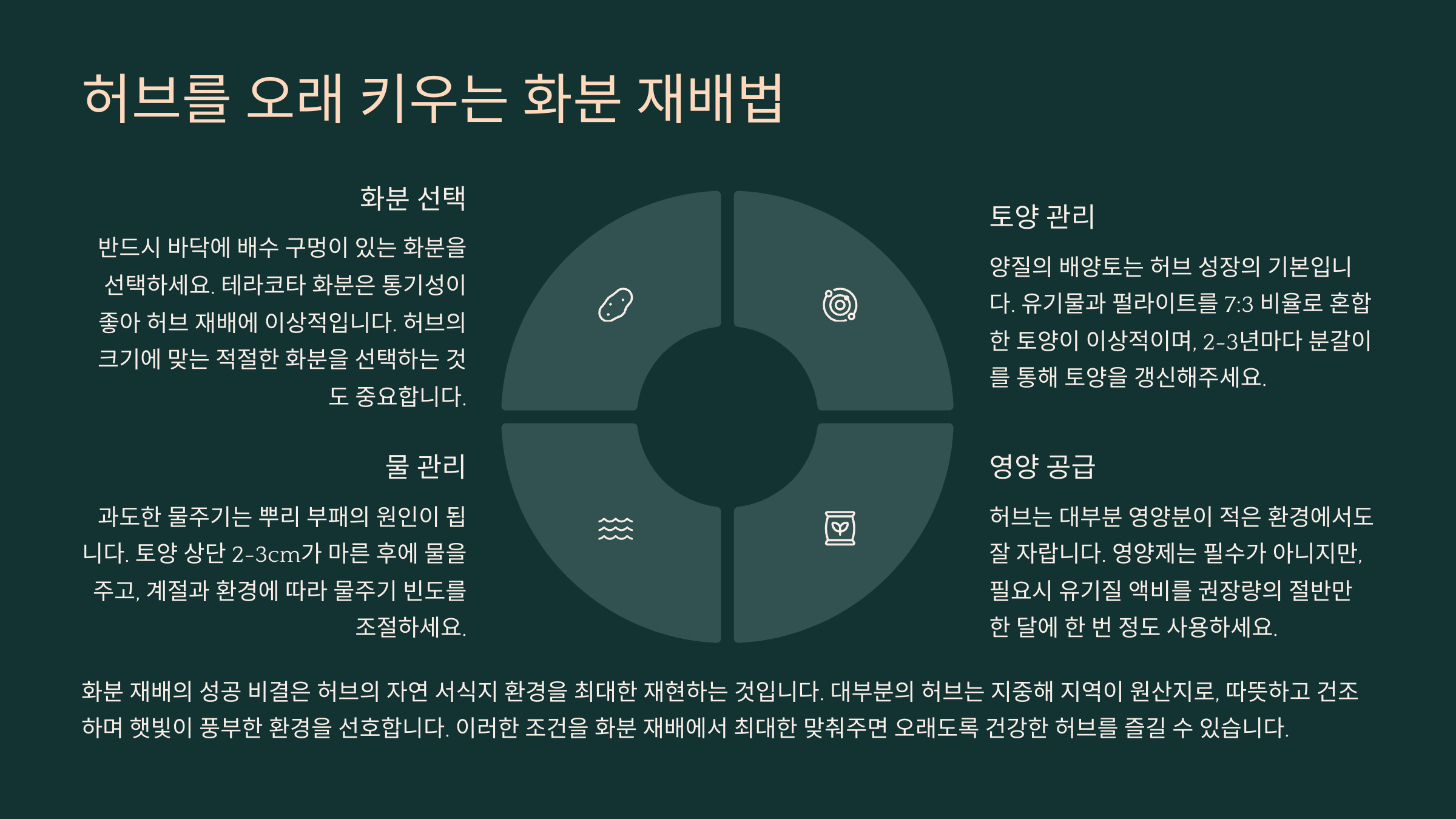 | 흙 구성 | 허브 전용토 + 펄라이트/마사토 | 처음 심을 때 |