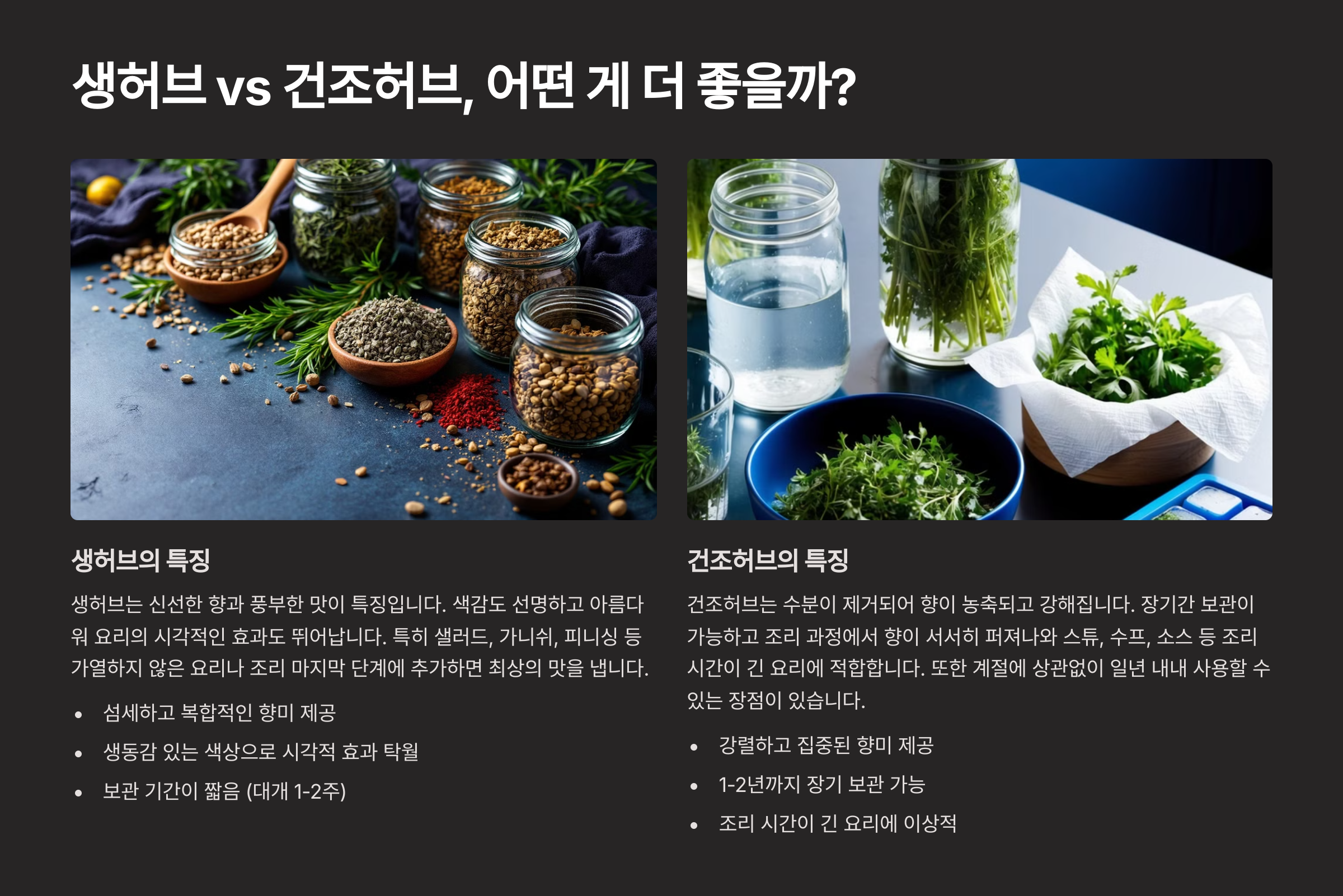 생허브와 건조허브는 각각 장단점이 달라요. 생허브는 신선한 향과 촉촉한 식감이 특징이고, 건조허브는 향이 진하고 보관이 쉬운 게 장점이죠. 어떤 게 더 낫다고 단정짓기보다는, 요리의 목적과 스타일에 맞게 선택하는 게 좋아요.