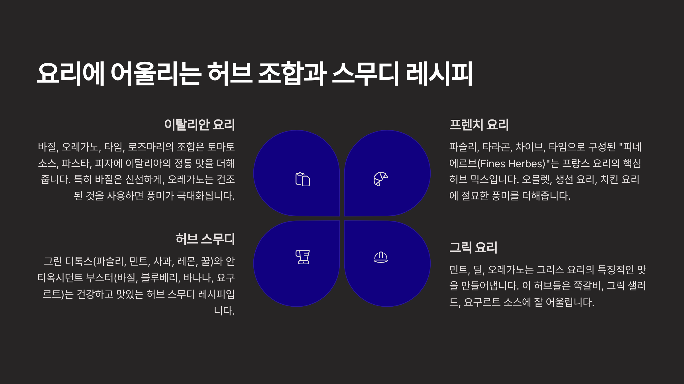 | 유형 | 기본 재료 | 추천 허브 | 활용 요리 |