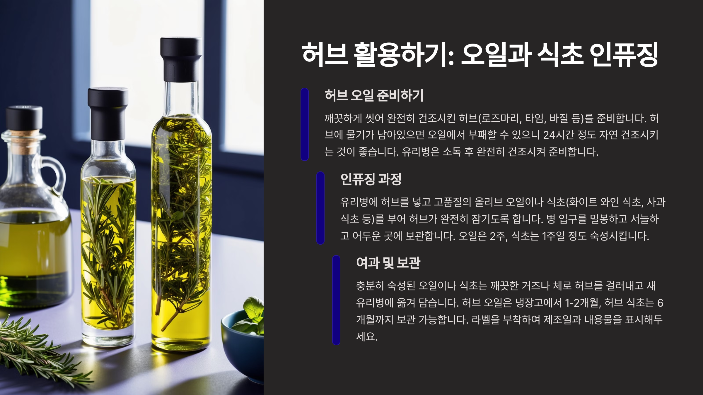허브를 오일이나 식초에 담가두면, 향긋한 풍미를 오래도록 즐길 수 있어요. 이렇게 만든 허브 인퓨전은 드레싱, 볶음요리, 마리네이드 등 다양한 요리에 활용할 수 있답니다. 만드는 법도 간단해서 누구나 쉽게 따라 할 수 있어요!