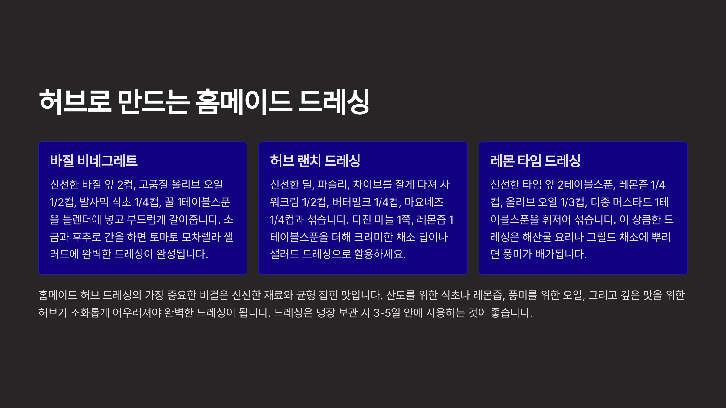 기본 허브 드레싱은 올리브오일, 식초(또는 레몬즙), 허브, 소금, 후추를 잘 섞어주기만 하면 끝이에요. 여기에 머스타드나 꿀을 넣으면 더욱 풍성한 맛이 나요. 상큼한 맛이 도는 민트나 바질을 넣으면 여름 샐러드에 딱이랍니다!