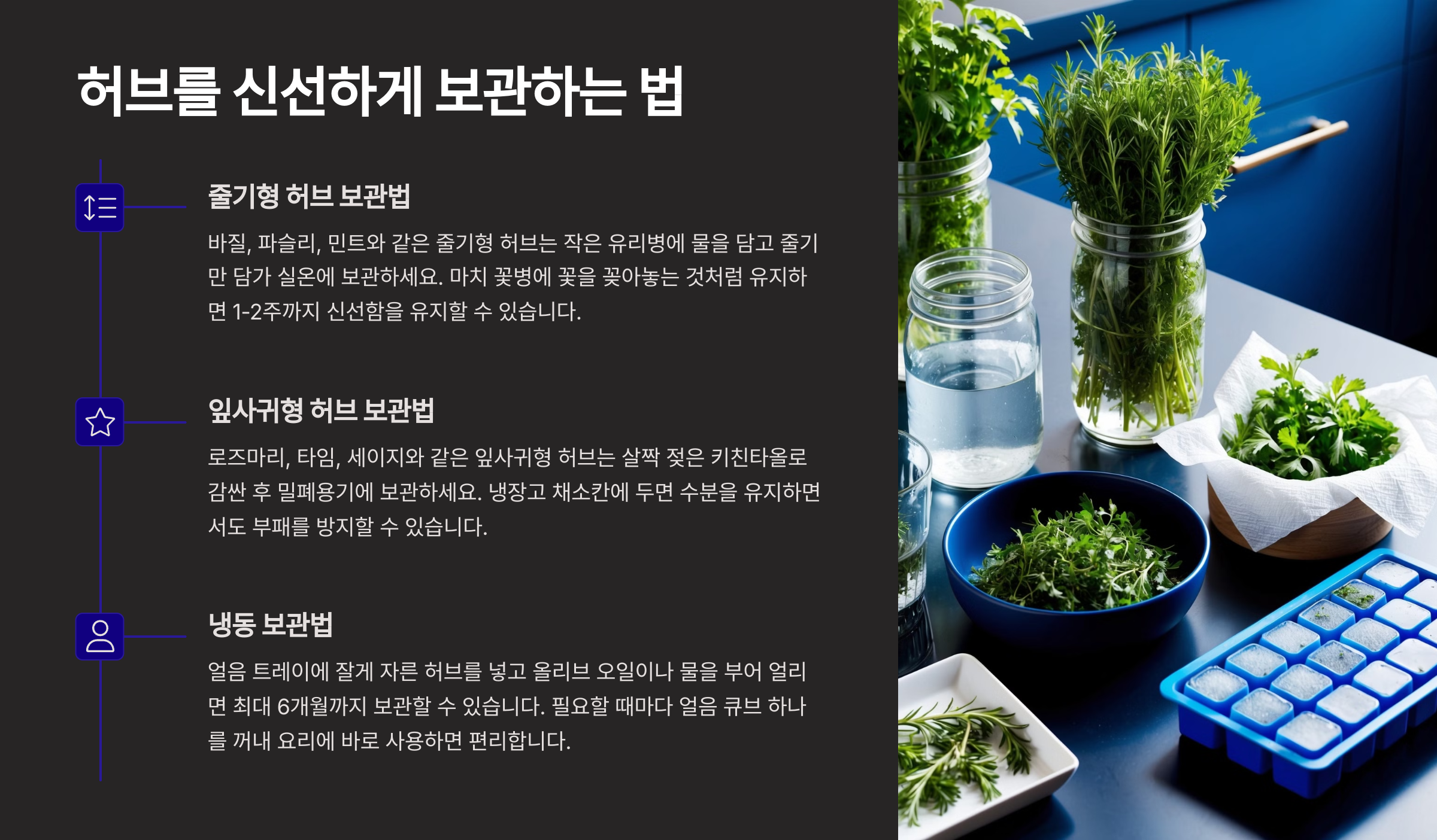 냉동 보관도 가능해요! 잘게 다진 허브를 얼음틀에 넣고 물이나 오일을 부어 냉동하면, 필요할 때 한 큐브씩 꺼내어 바로 사용할 수 있어서 정말 편하답니다. 이건 정말 꿀팁이에요! ❄️
