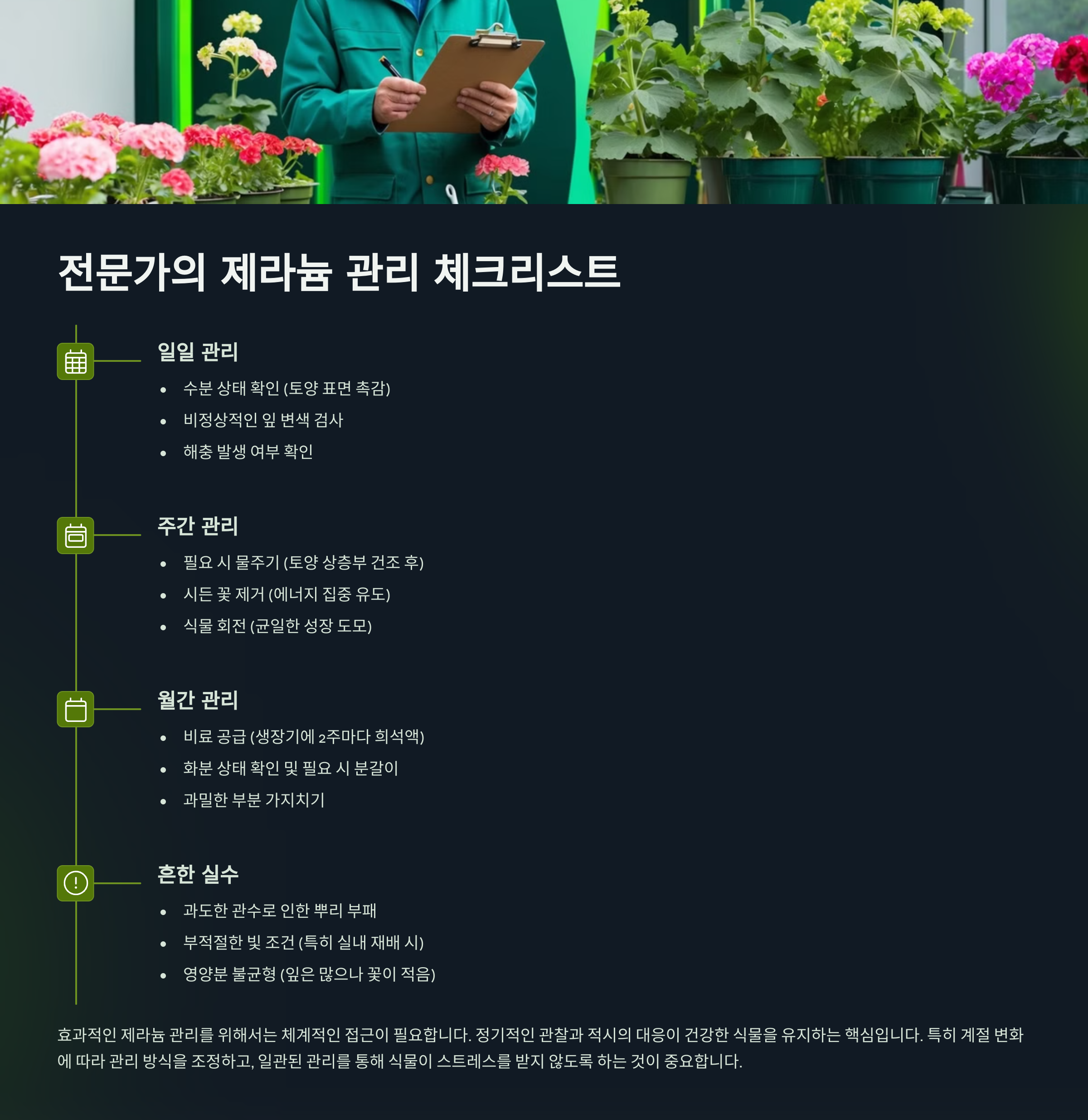 이런 체크리스트를 프린트해서 화분 옆에 붙여두거나, 휴대폰 알림으로 설정하면 실수 없이 제라늄을 기를 수 있어요. 꼼꼼한 관리가 진짜 비결이에요!
