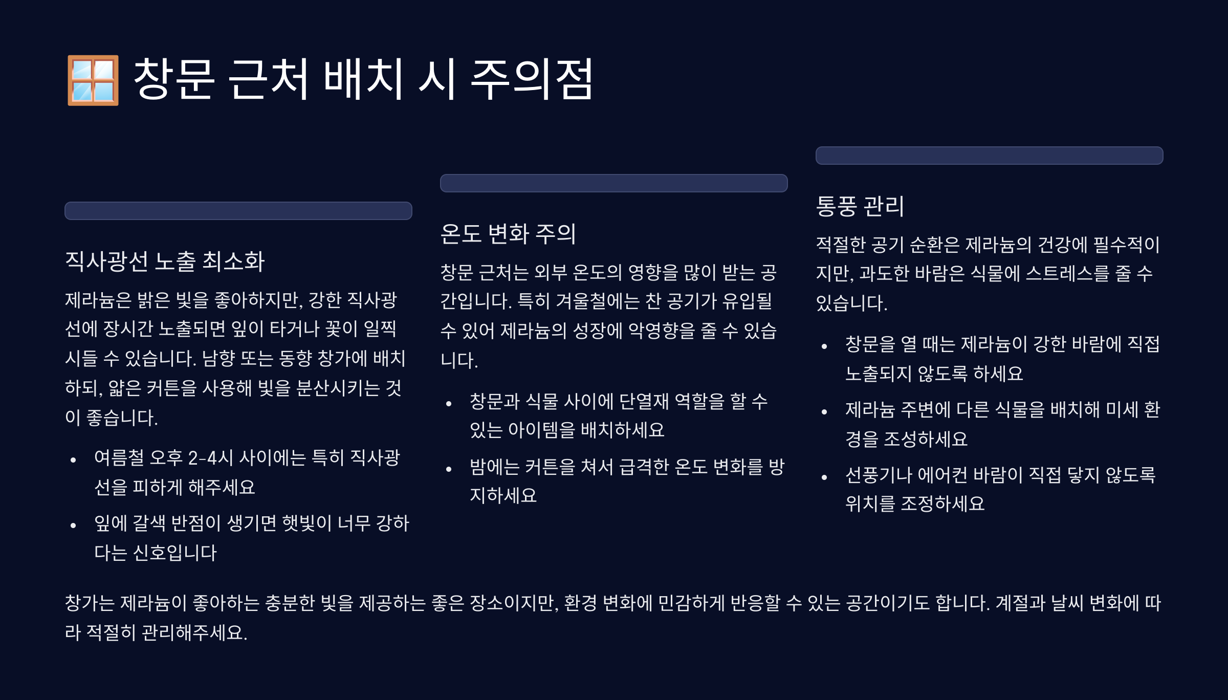 | 남향 창가 | 습도 조절 필수 | 낮에는 창 열고 환기 |