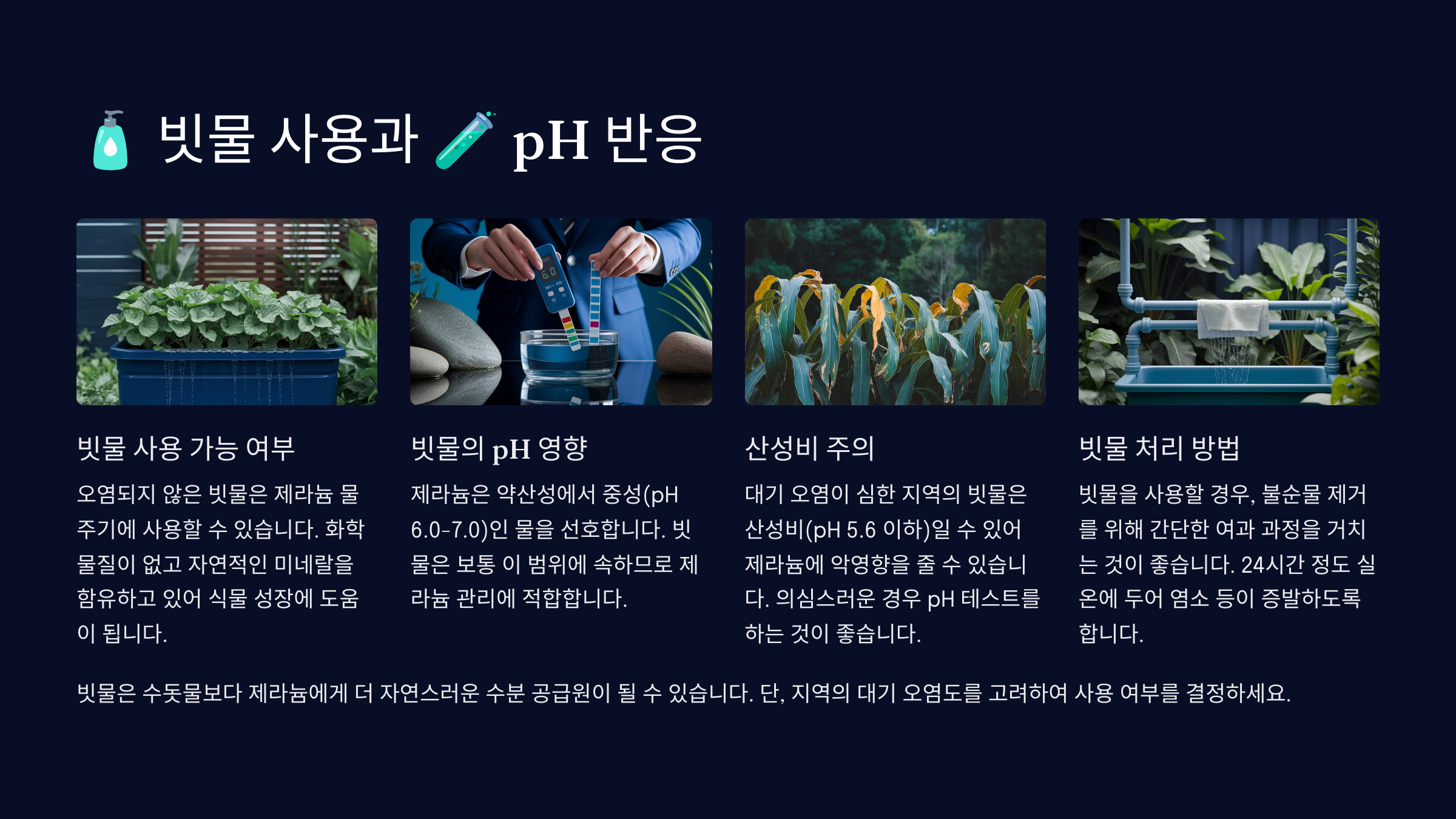 정말 빗물을 활용하고 싶다면, 간단한 pH 시험지로 수치를 체크해보는 걸 추천해요. pH 5.8 이하라면 사용을 피하고, pH 6.2 이상이면 안심하고 사용할 수 있어요. 알칼리성 조정은 베이킹소다를 아주 소량 넣는 방법도 있답니다.