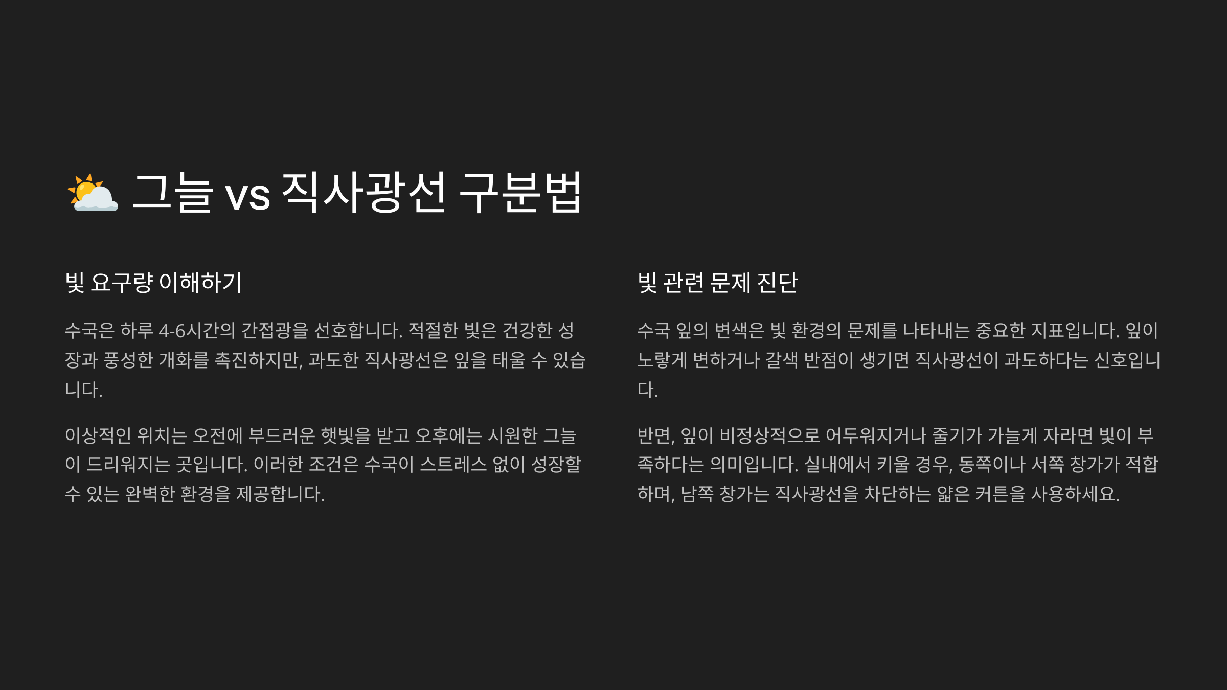 | 직사광선 (4시간 이상) | 잎 끝 타거나 시듦 | 커튼이나 그늘막 필수 |
