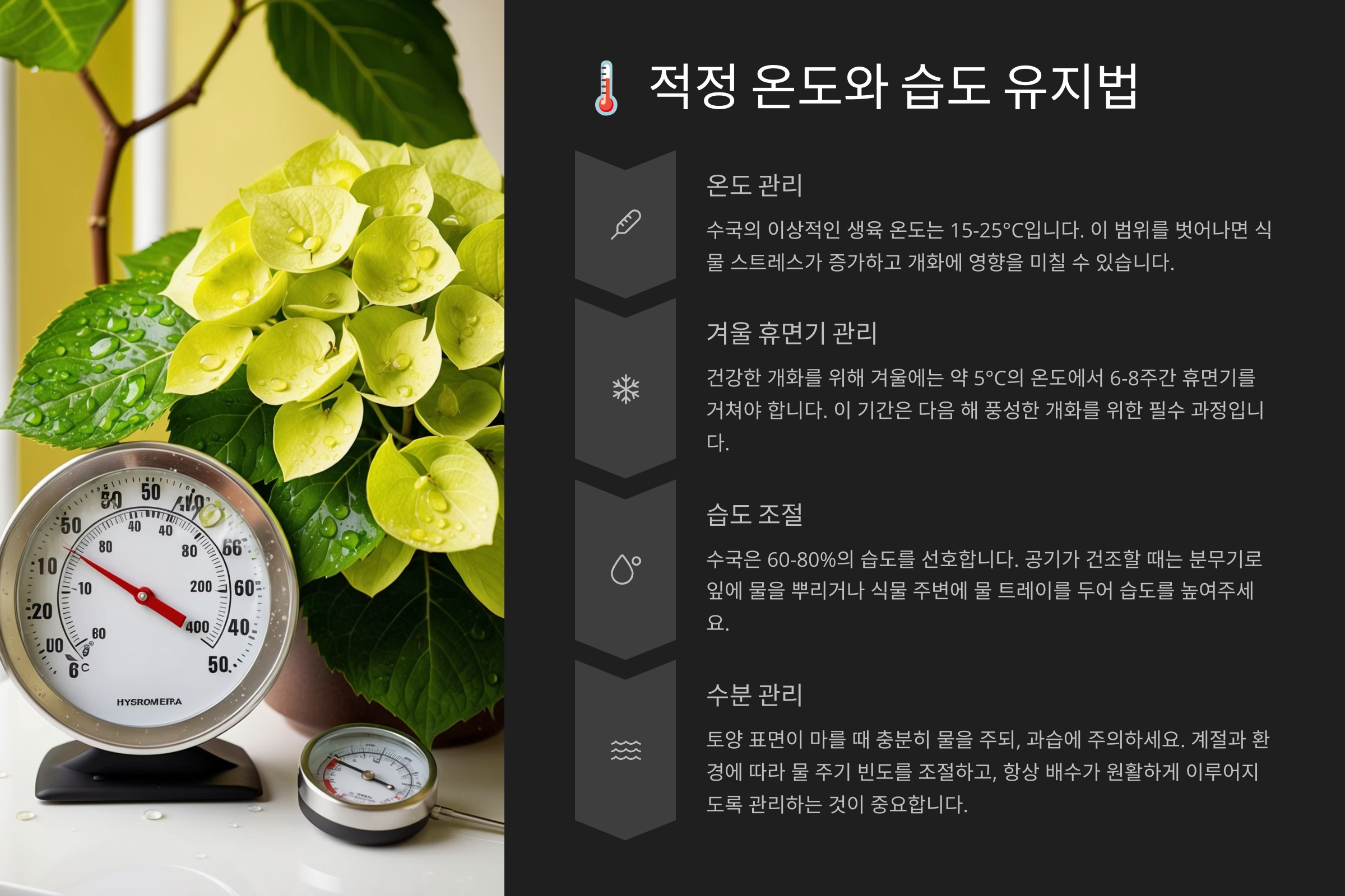 이제 조도의 중요성 이해되셨죠? 다음은 수국이 잘 자라기 위한 온도와 습도 관리 방법 알려줄게요! 🔥💧