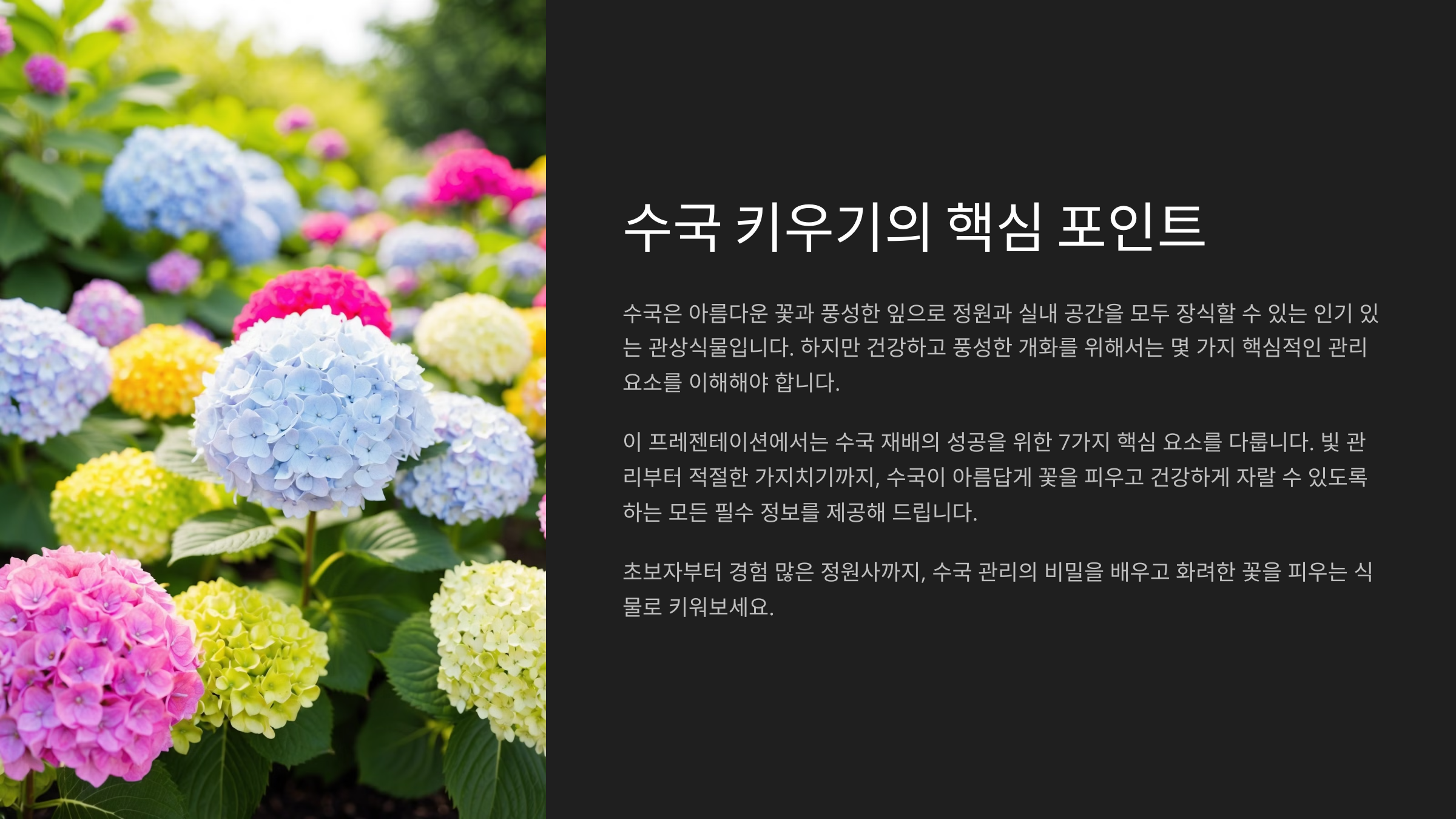 지금부터는 수국 생존 가이드 본격적으로 알려줄게요. 이어지는 글에서 빛, 온도, 뿌리, 영양제, 병해충, 가지치기까지! 하나라도 놓치지 마세요! 📘