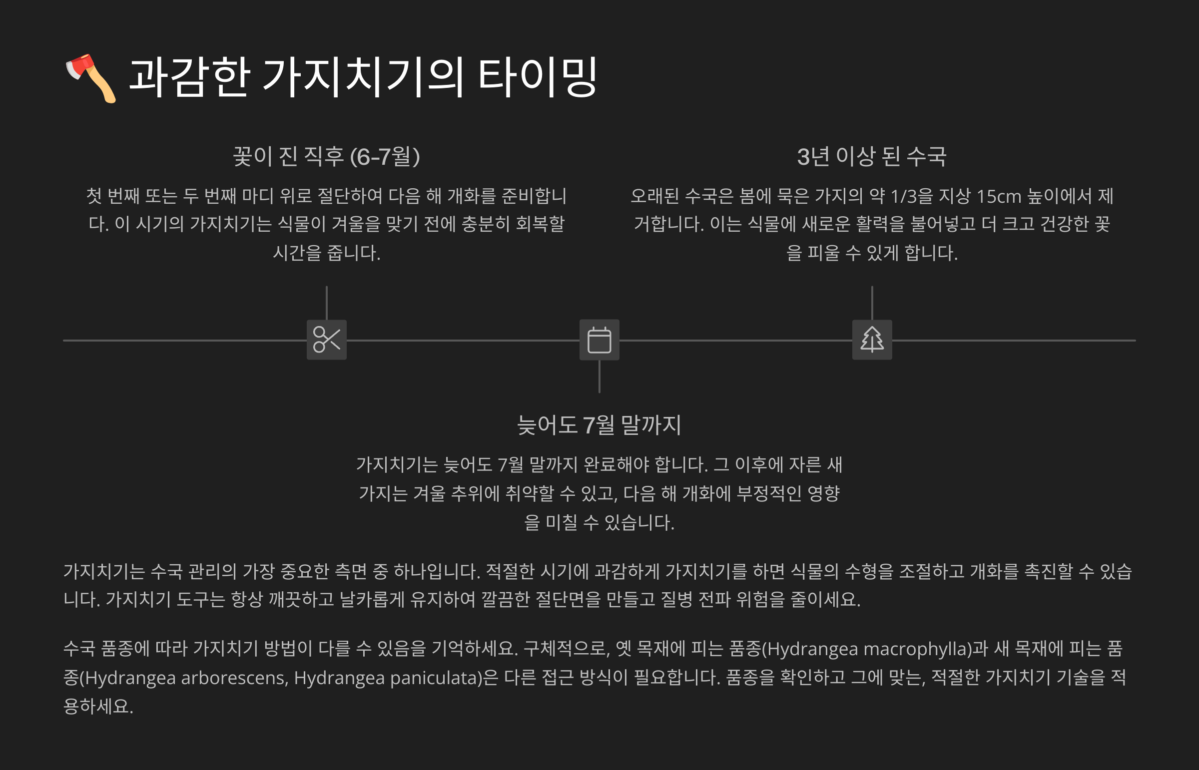겨울엔 절대 가지치기를 하면 안 돼요! 이 시기엔 수국이 휴면기에 들어가기 때문에 건드리면 스트레스를 크게 받아요. 그리고 어린 수국은 2년차까지는 가지치기보다 환경 적응에 집중해주는 게 좋아요.