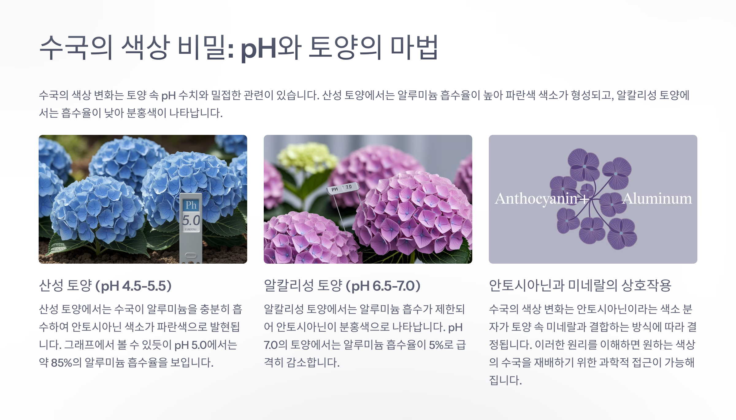 수국 색은 손끝에서 만들어져요. pH 조절은 어렵지 않지만, 정성이 필요한 작업이에요!