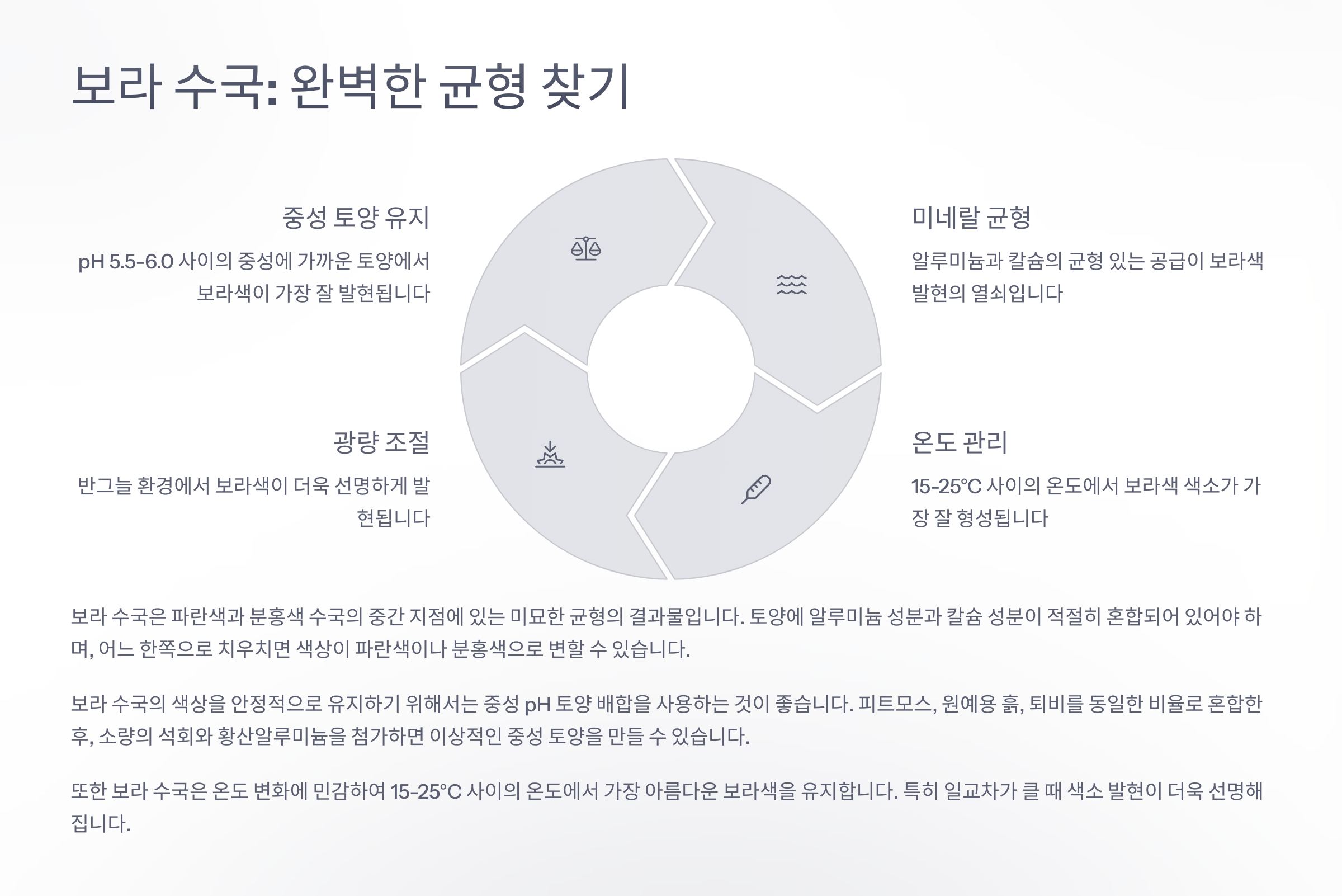 보라 수국은 토양의 pH가 5.8~6.2 사이, 중성에 가까운 약산성에서 만들어져요. 산성과 알칼리성이 조화롭게 중간선에 위치해야만, 두 색소가 함께 작용해서 보라빛을 띠게 되죠.
