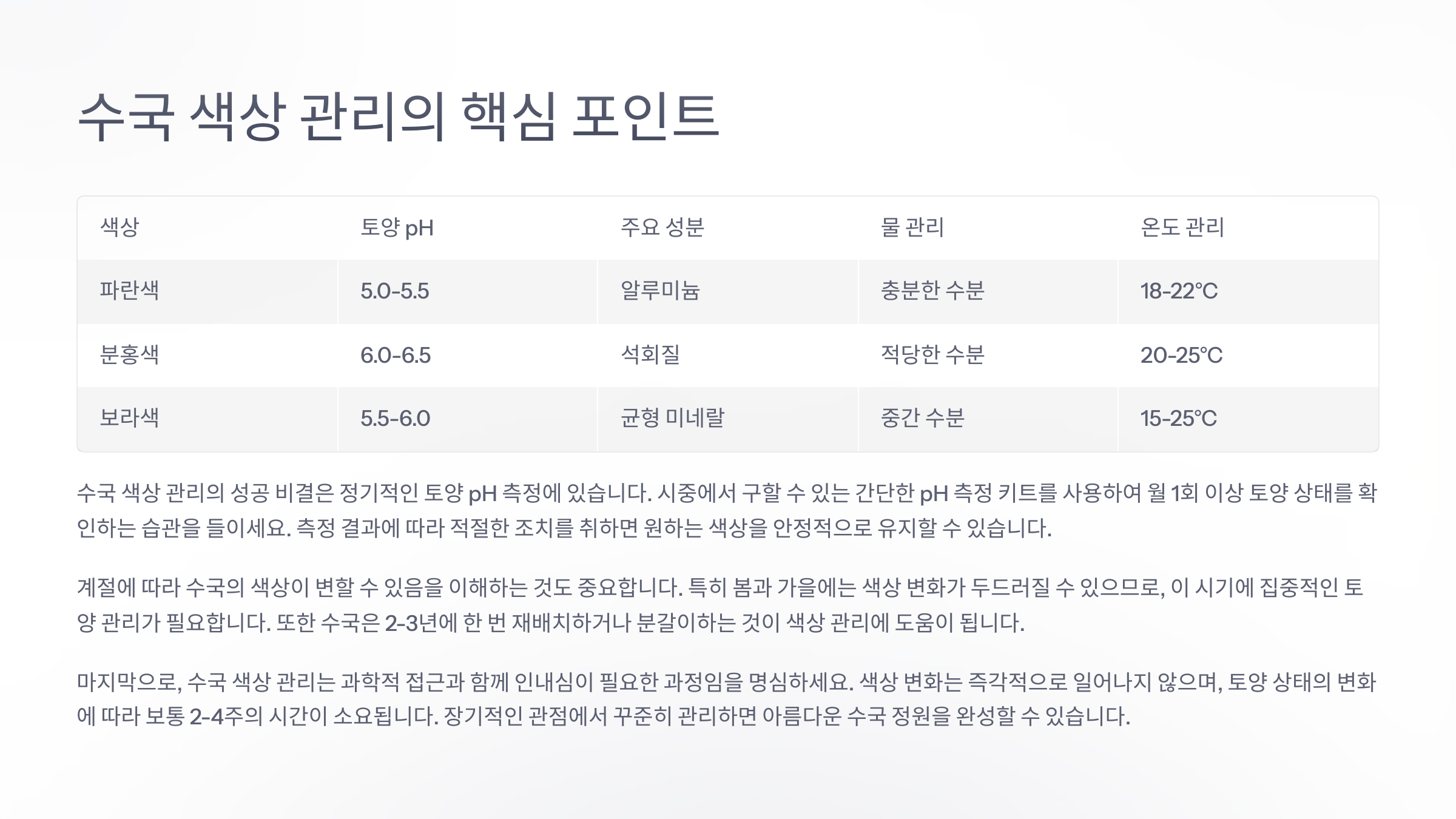 ⚖️ 수국 색상별 pH 조절 재료표