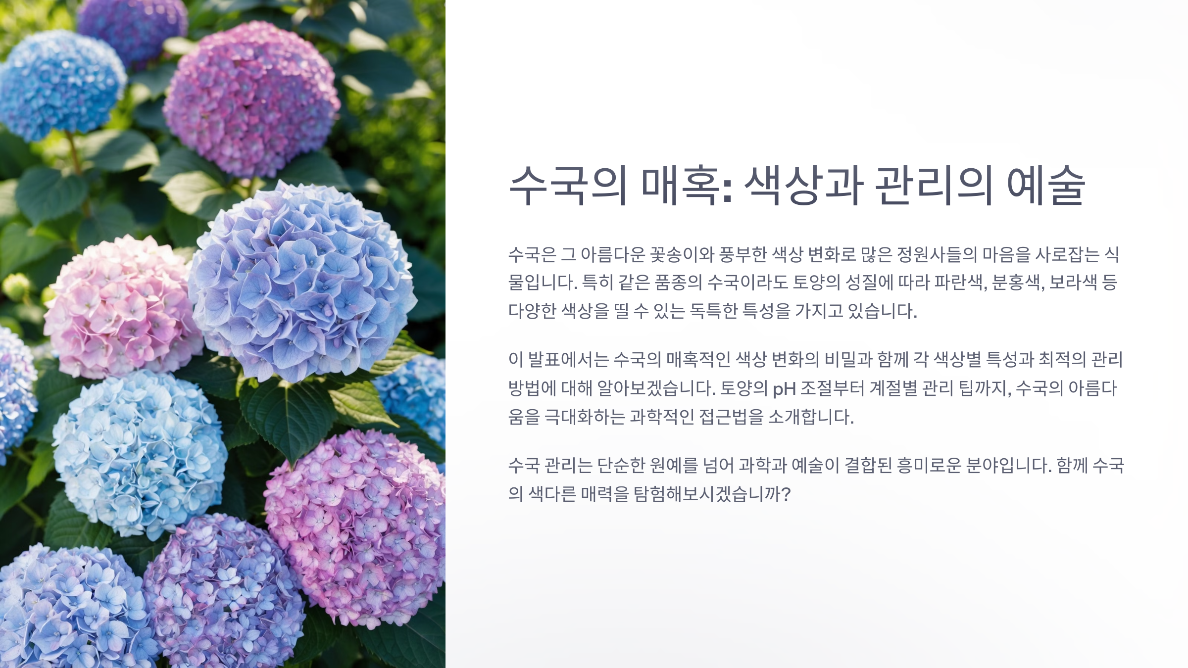 사실 수국의 색상은 '환경'이 결정해요. 특히 흙의 pH, 영양 상태, 햇빛, 온도 등 여러 요인이 조화를 이루면 우리가 원하는 그 색이 딱 나오는 거예요. 같은 화분이라도 관리법이 다르면 색이 완전히 달라질 수 있답니다!