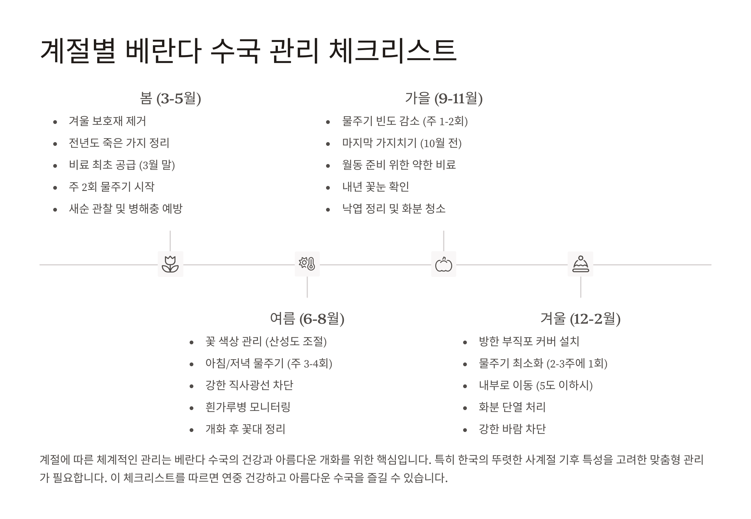 베란다 환경은 계절마다 변동이 심해요. 그래서 수국 관리도 계절에 따라 달라져야 해요. 사계절을 기준으로 꼭 체크해야 할 포인트들을 정리했어요!