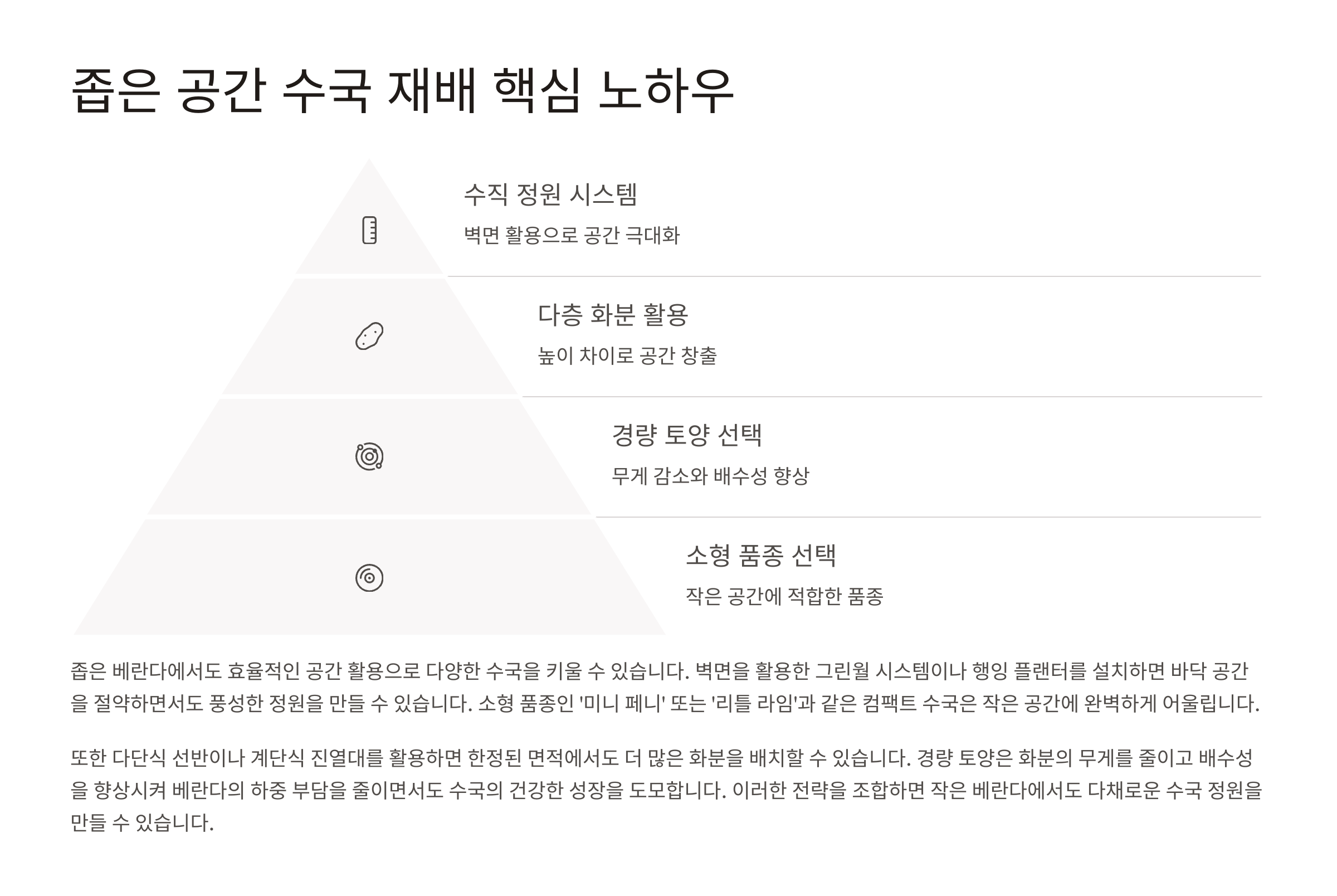 화분 선택 | 중형, 깊은 화분 | 공간 절약, 뿌리 안정 |