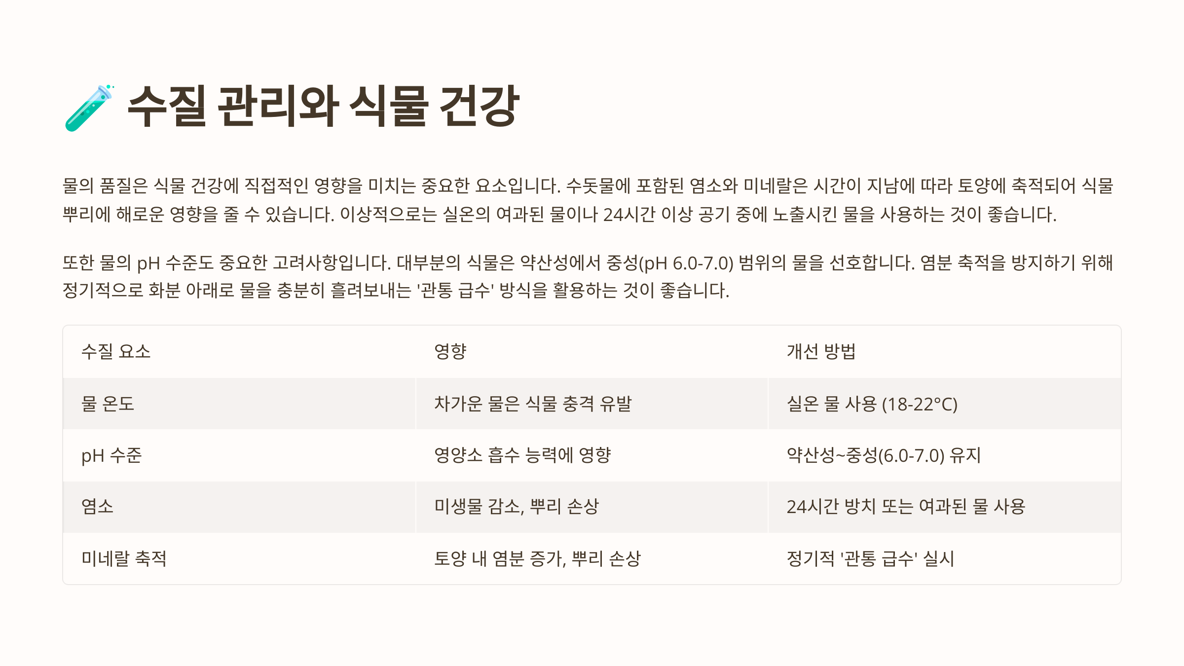 | 염소 많은 수돗물 | 잎 끝 마름, 누런 잎 | 24시간 방치 후 사용 |