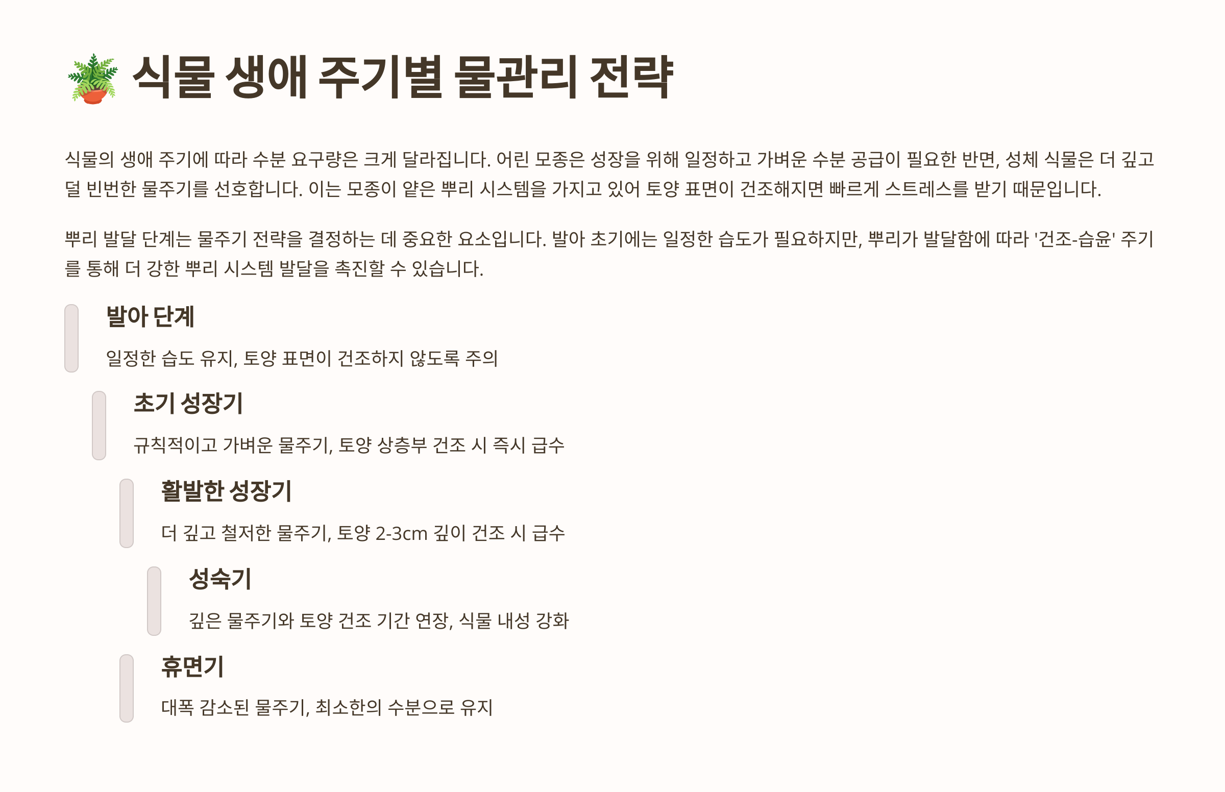 | 소량을 자주 | 겉만 젖음, 뿌리 얕아짐 | 약한 식물체 |
