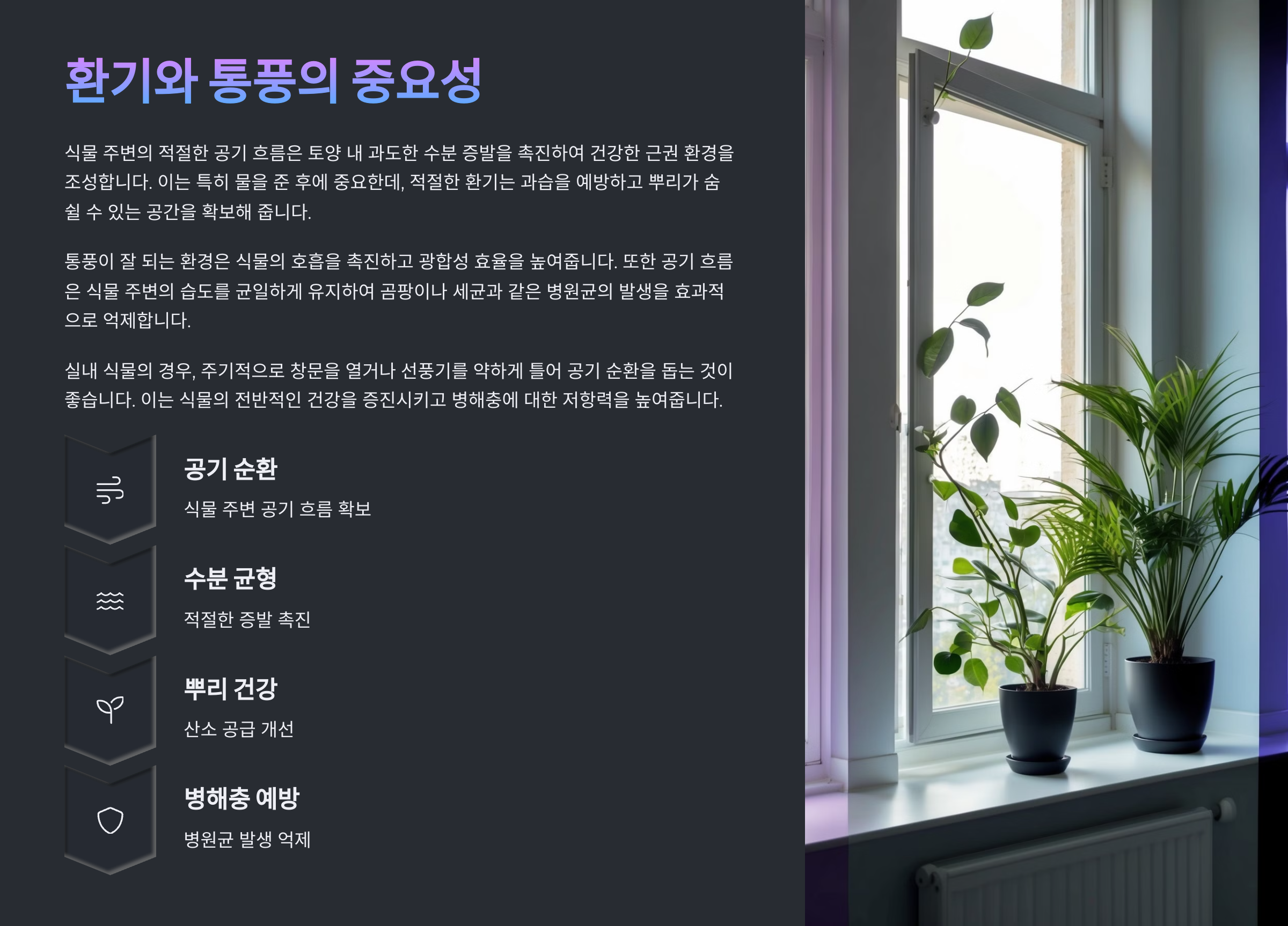 | 잎에 검은 반점 발생 | 통풍 부족 + 고온다습 | 선풍기 활용, 창문 개방 |