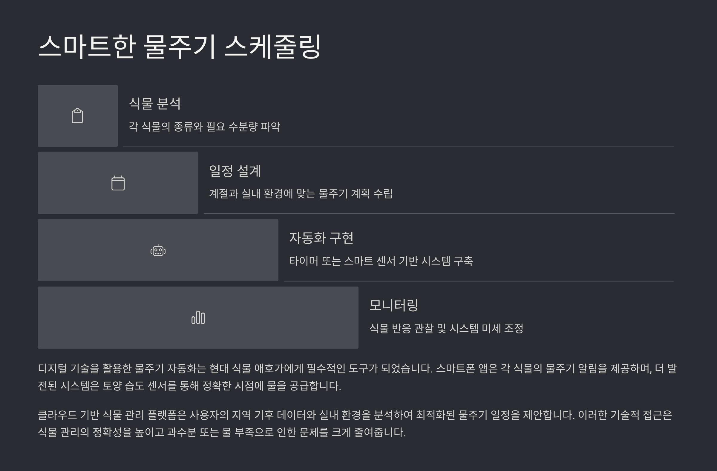 식물은 기계처럼 매번 똑같이 반응하지 않기 때문에, 자동화하더라도 ‘관찰’은 여전히 중요해요. 스케줄을 세우되, 흙이 아직 젖어 있다면 하루 미루고, 예상보다 마르면 하루 당겨주는 유연함도 필요해요.