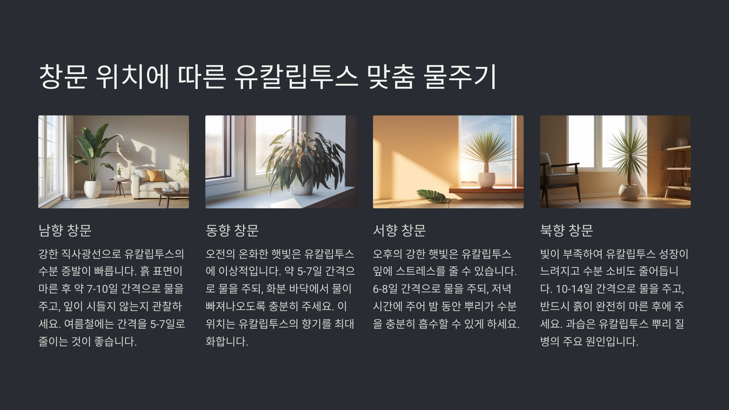 결론적으로, 실내에서 유칼립투스를 키운다면 “창문의 방향”을 꼭 기억해야 해요. 같은 식물이라도 위치에 따라 물 주는 주기와 양이 전혀 다르거든요. 이것만 기억해도 반은 성공이에요! 🌞