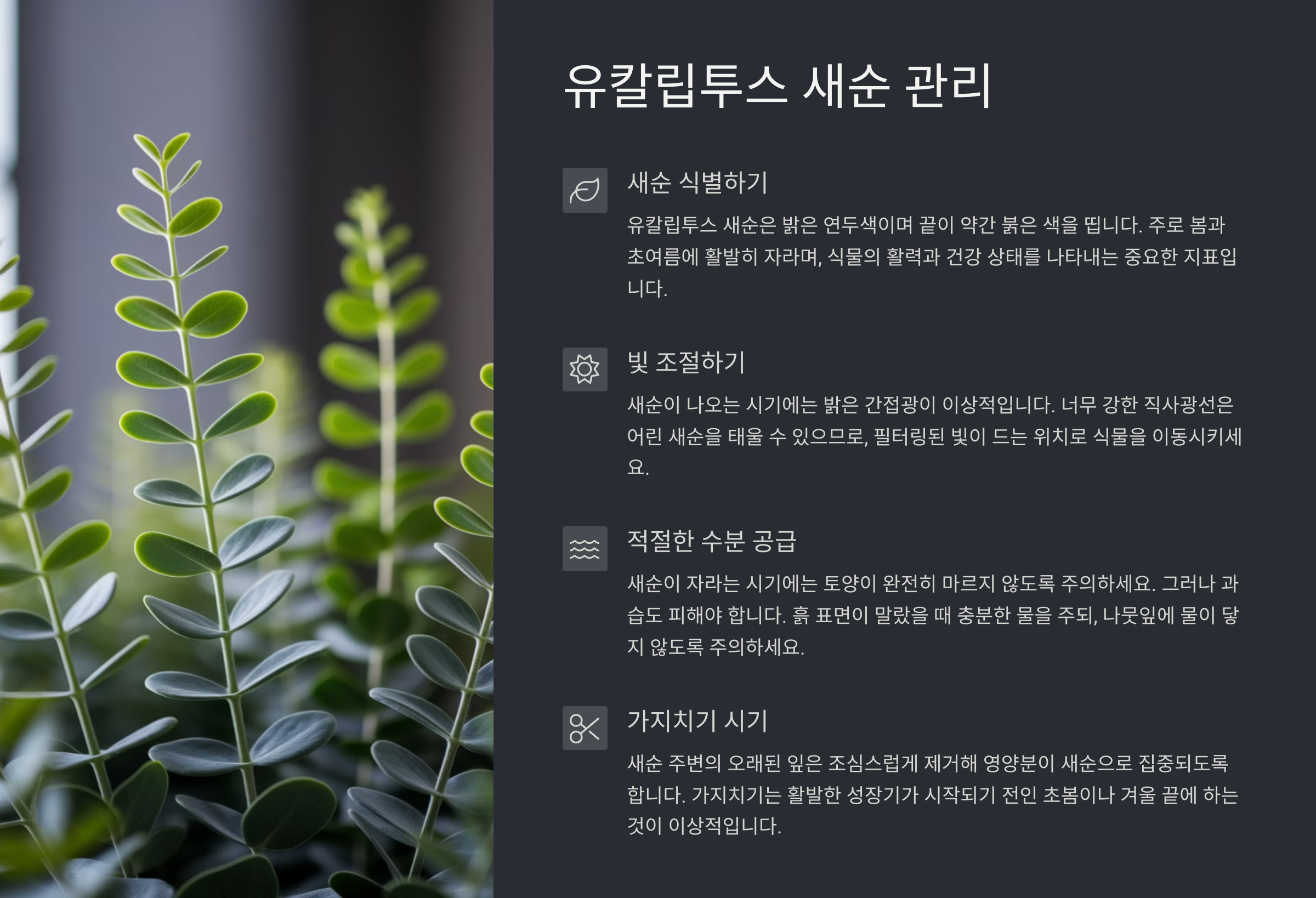 결론적으로 자동화는 ‘보조수단’이에요. 유칼립투스는 민감한 만큼, 자동화에만 의존하지 말고 내가 직접 반응을 읽어주는 것이 가장 확실한 관리 방법이에요 🌱