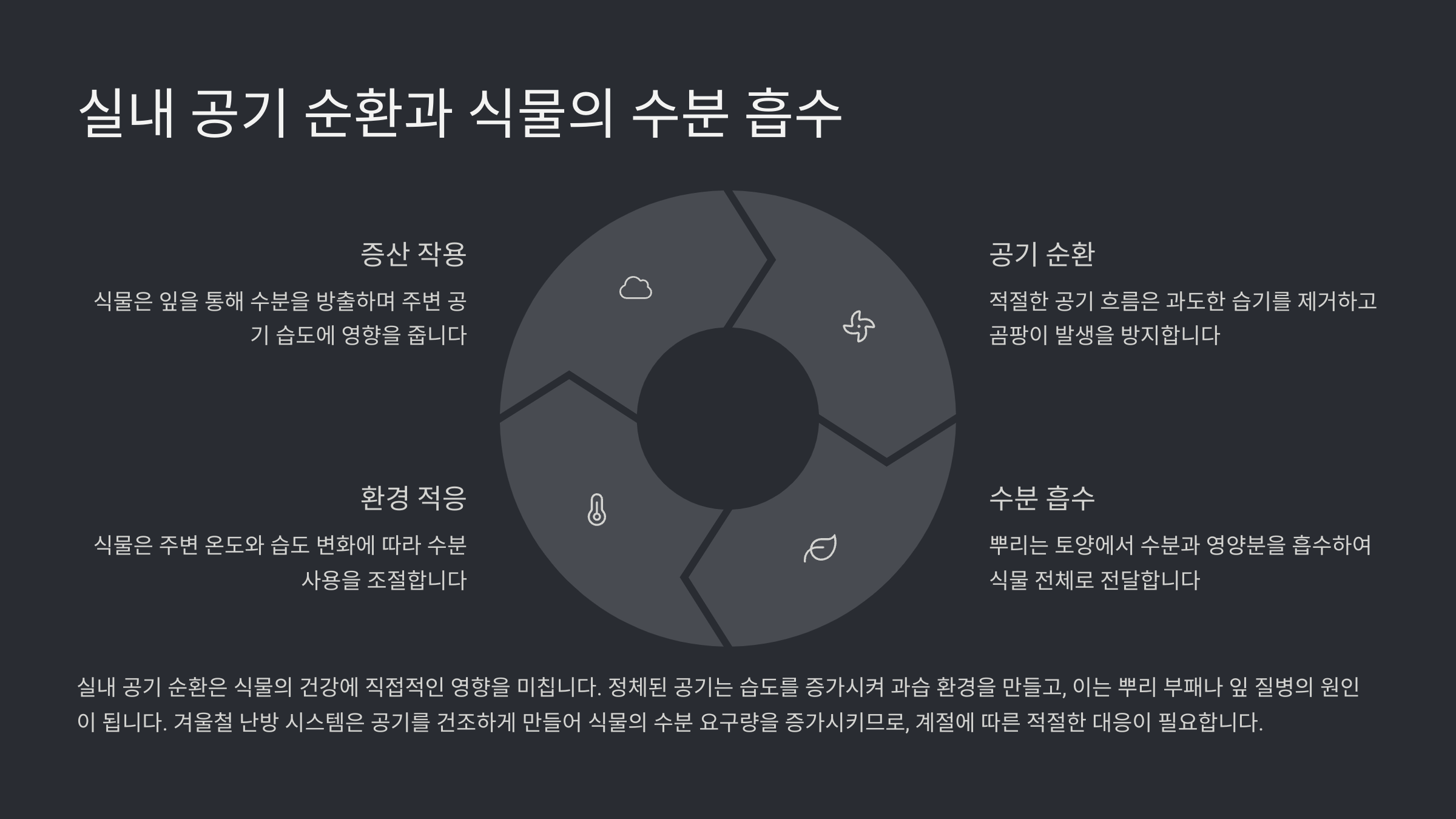 결국 공기 흐름과 물 흡수는 한몸이에요. 실내 유칼립투스가 숨 쉬듯 물을 흡수하고, 잎과 뿌리 모두 건강하게 유지되기 위해선 공기 흐름을 신경 써줘야 해요. 눈에 보이지 않지만 아주 중요한 포인트랍니다!