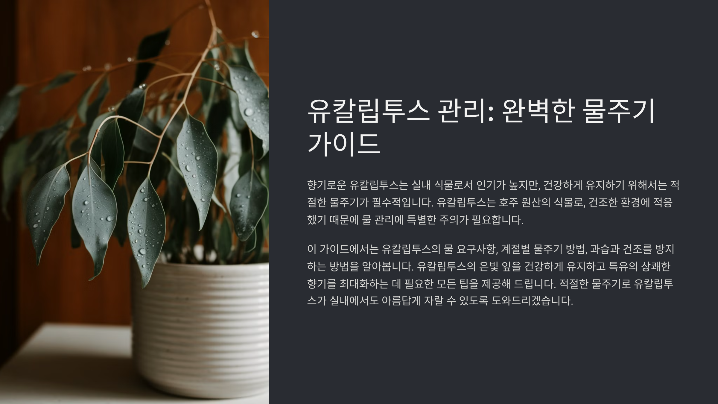 유칼립투스는 상쾌한 향기와 아름다운 잎 모양 덕분에 실내에서 키우는 분들이 많아졌어요. 하지만, 생각보다 물을 민감하게 받아들이는 식물이기도 해요. 특히 실내 환경에서는 물의 양, 주기, 통풍 등 다양한 요소들이 맞아떨어져야 건강하게 자랄 수 있답니다.