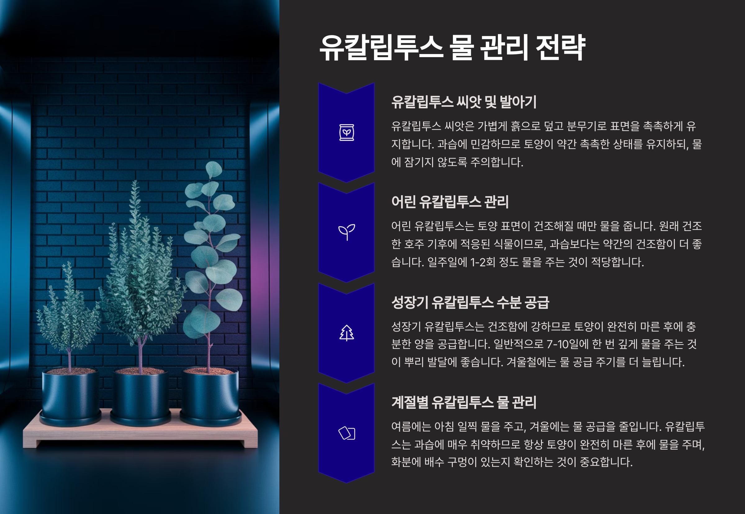 생장을 촉진하고 싶다면, 물은 단순히 공급하는 자원이 아니라 ‘활성화 도구’라고 생각해보세요. 물을 활용해 더 건강하고 활력 있는 유칼립투스를 만들 수 있어요! 🌿