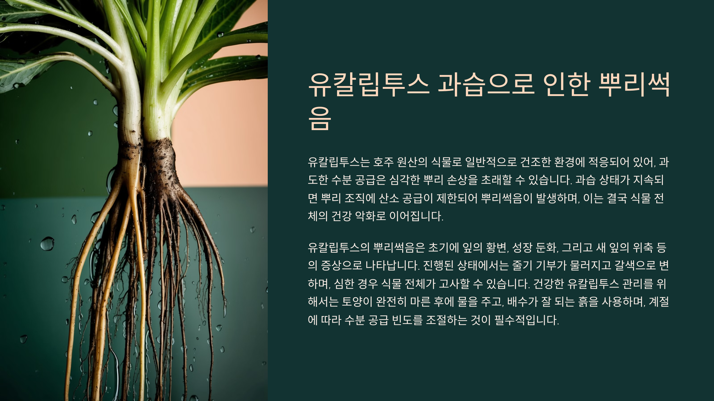 유칼립투스 물주기에서 가장 흔한 실수는 '과습'이에요. 식물이 물을 좋아한다고 생각해서 매일 주거나, 흙이 덜 마른 상태에서 또 물을 주는 경우가 많죠. 하지만 유칼립투스는 뿌리가 물에 오래 잠겨 있으면 숨을 쉬지 못해요.