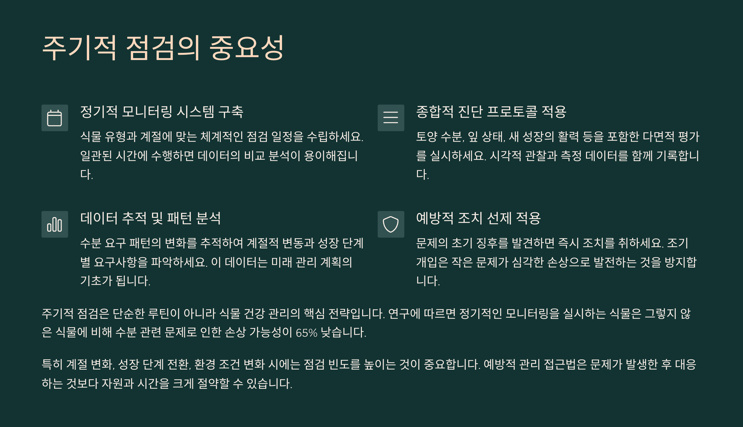 주기적인 점검은 ‘문제 예방’의 시작이에요. 예를 들어, 흙에 곰팡이가 피기 시작했다면 물 주기 조정과 통풍 강화로 해결할 수 있고, 잎이 연해졌다면 급수량 점검으로 쉽게 회복시킬 수 있어요.